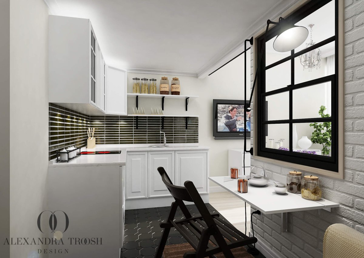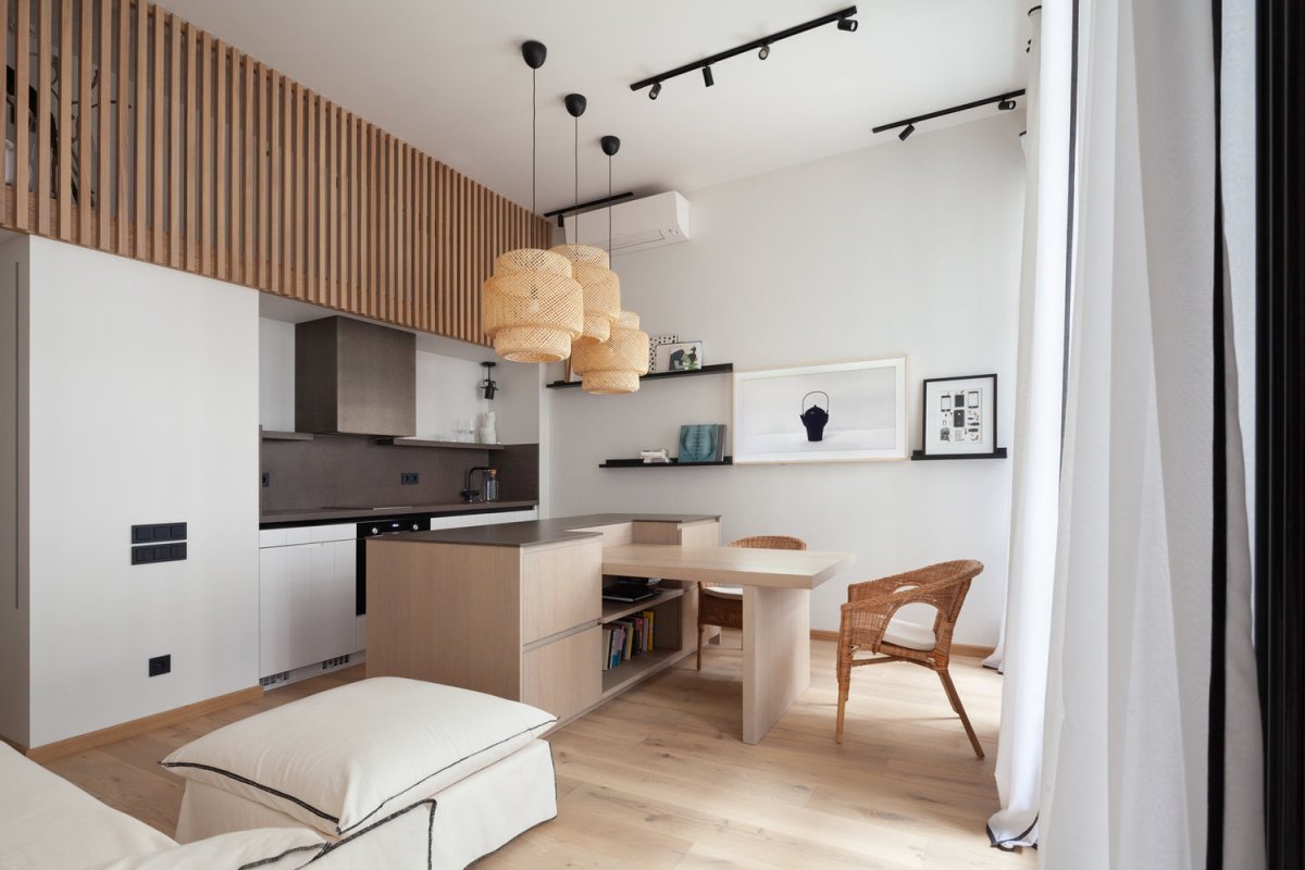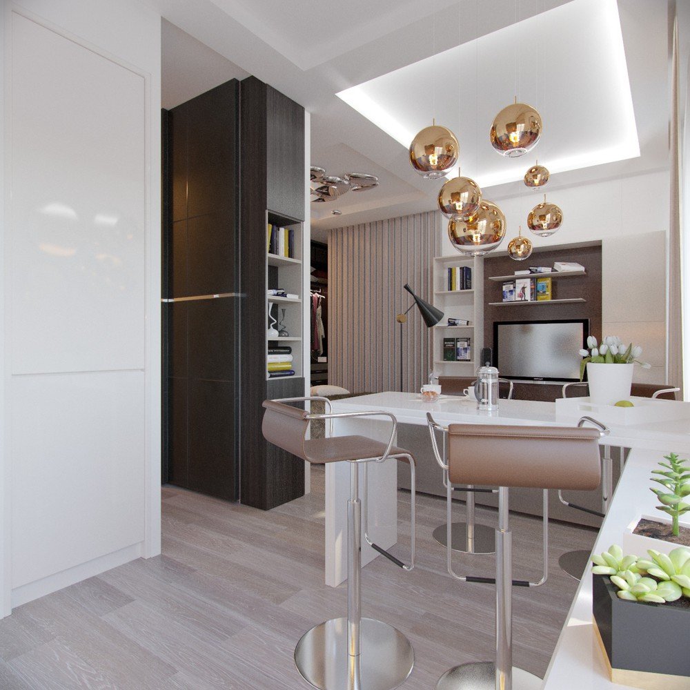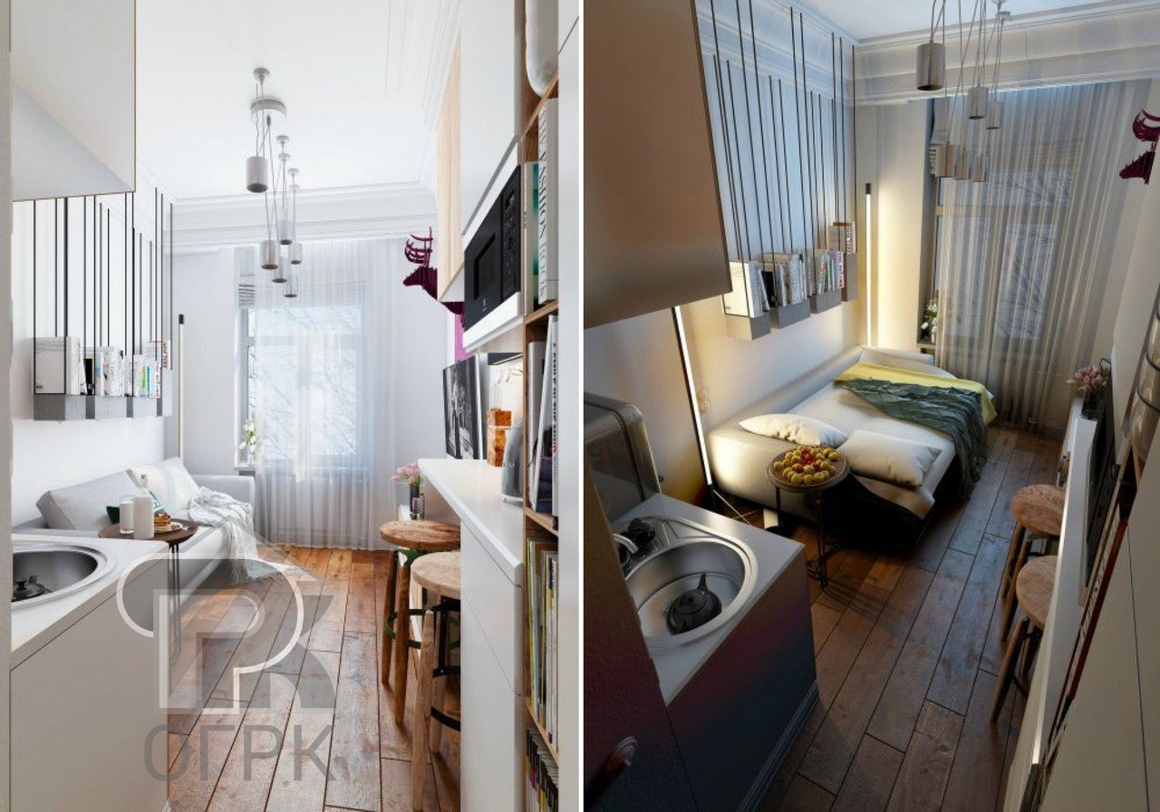 Зонирование кухни в студии 28 кв.м