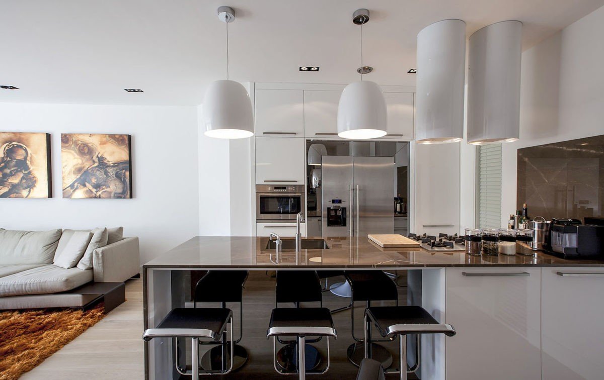 Кухня без навесных шкафов угловая с барной стойкой