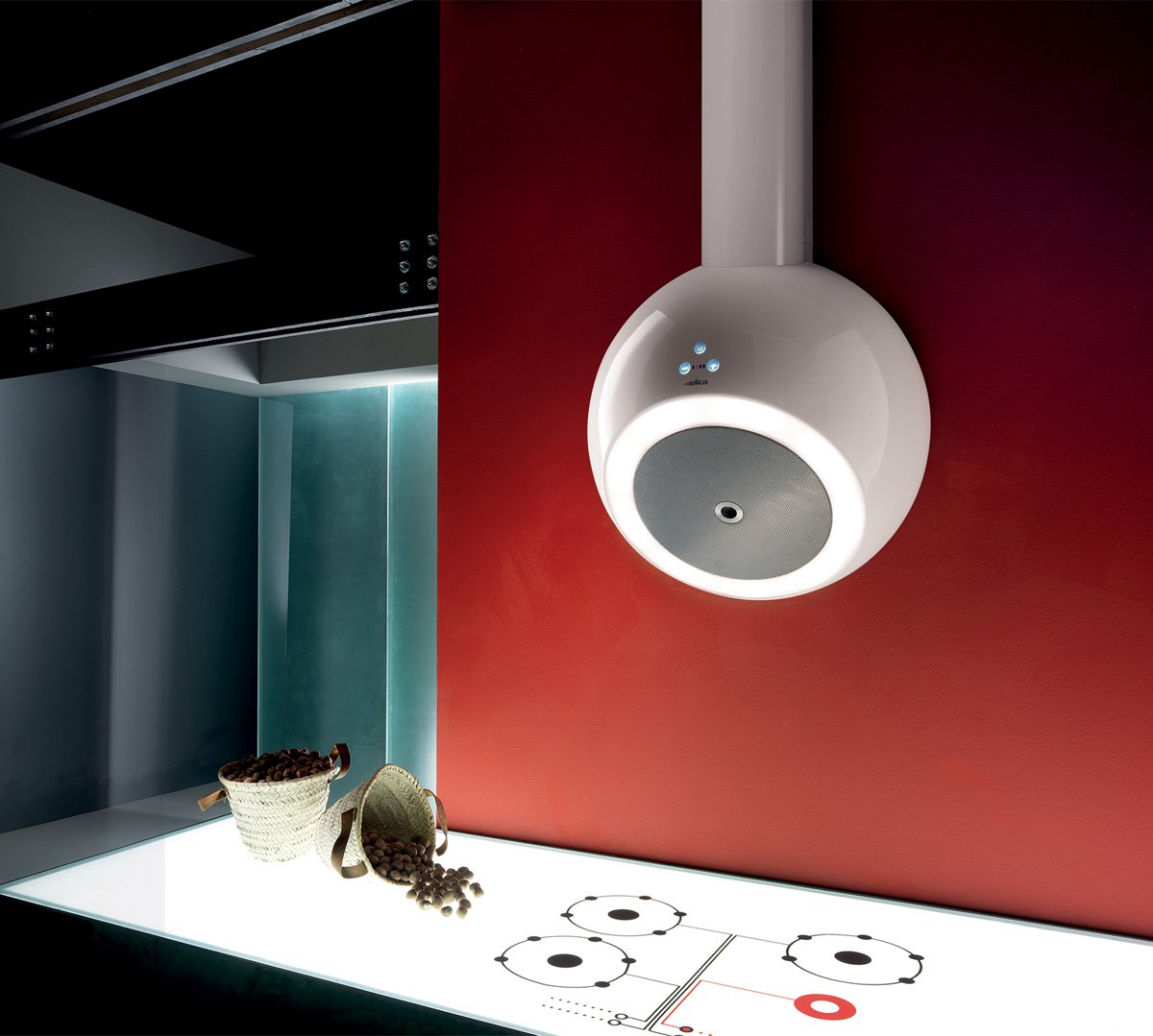 Круглая вытяжка для кухни в интерьере на стене