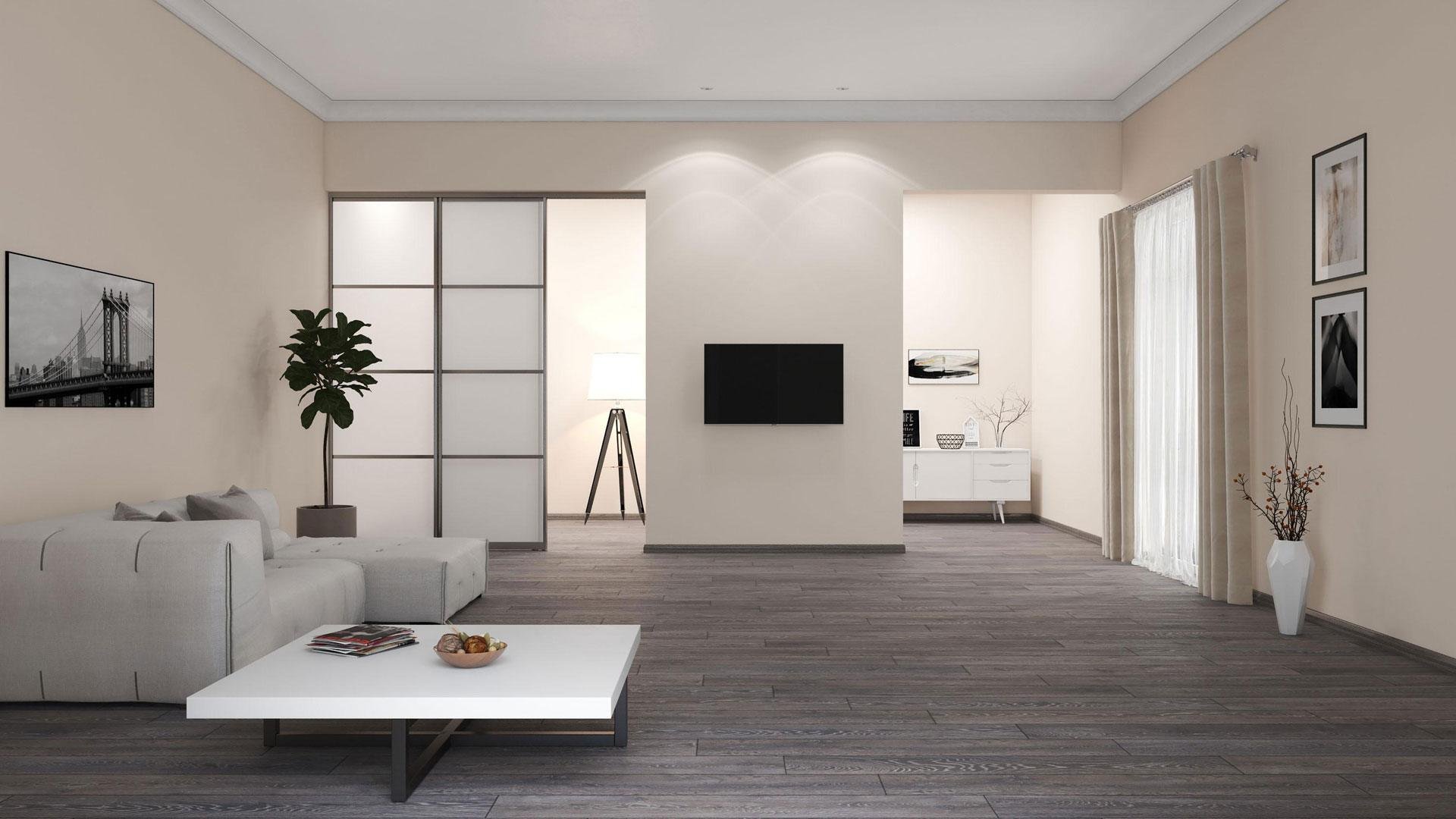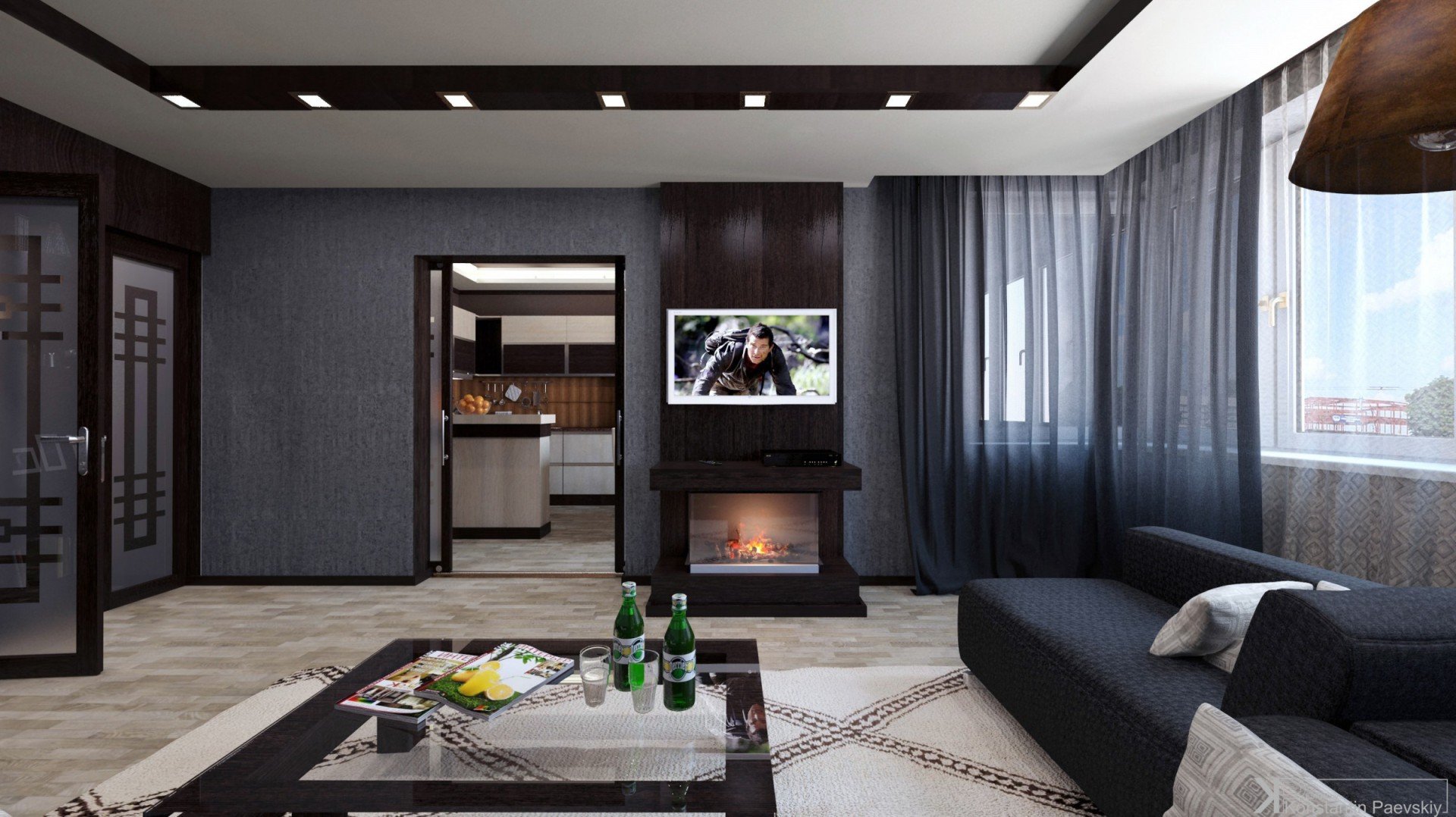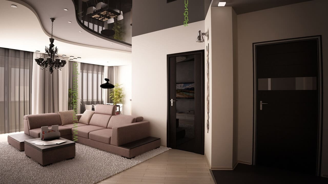 Интерьер гостиной с темными дверями