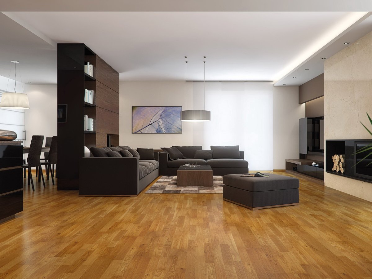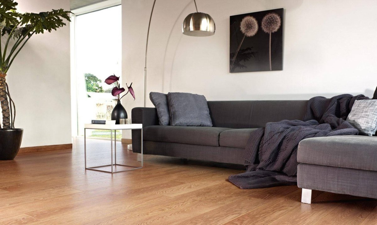 Интерьер гостиной с темным ламинатом