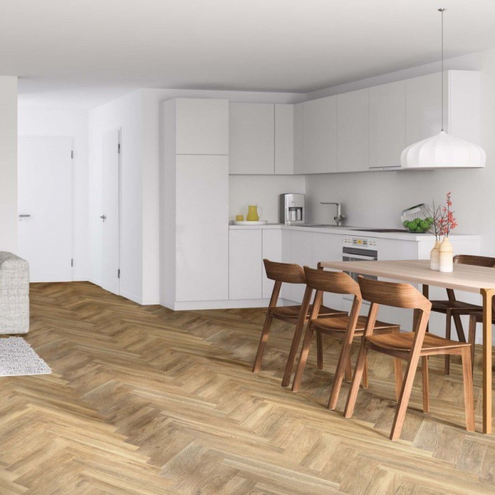 ПВХ-плитка для пола елочка на кухне