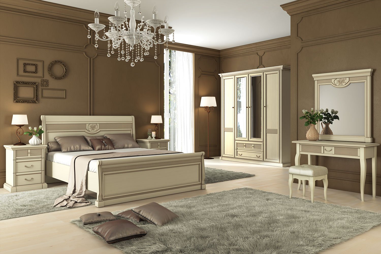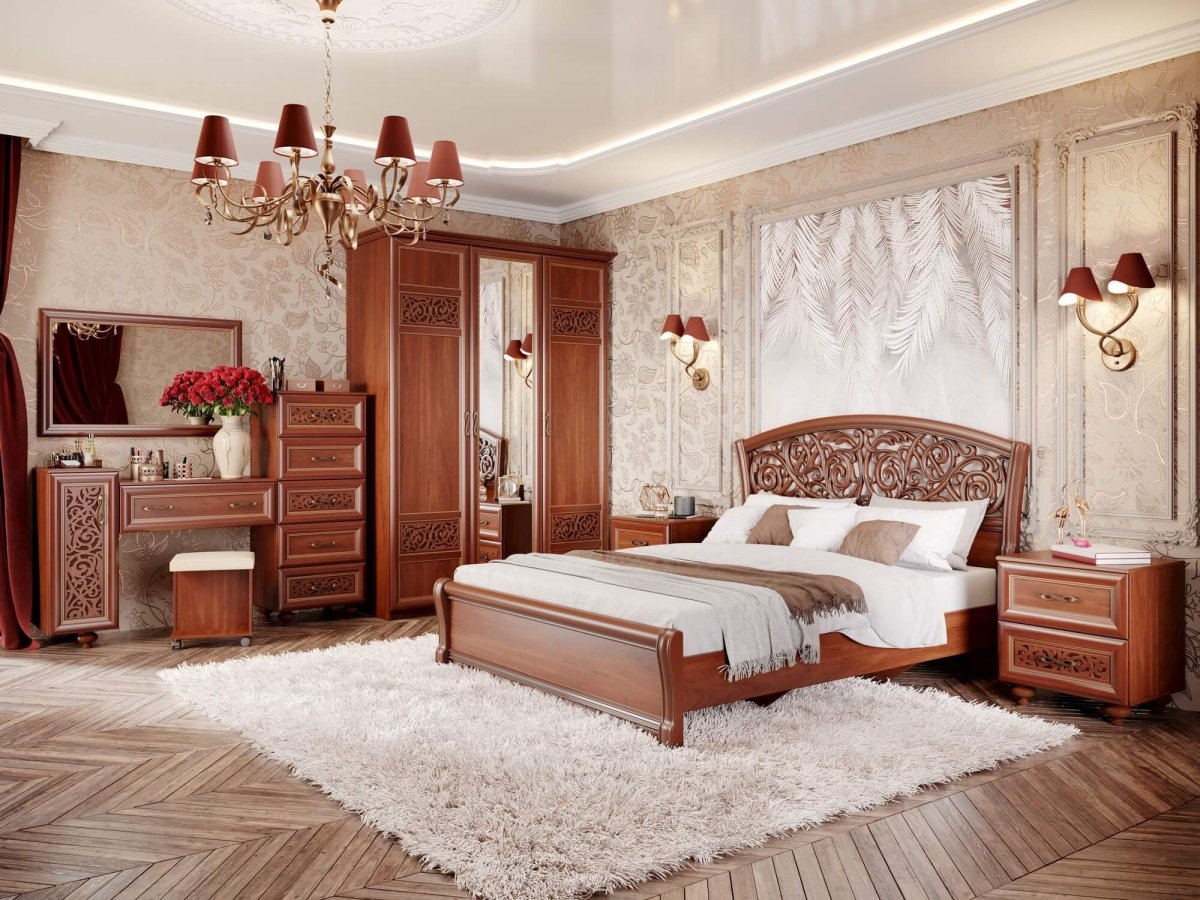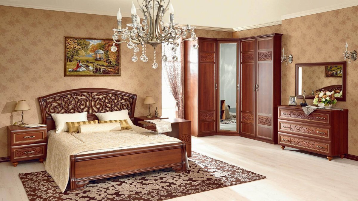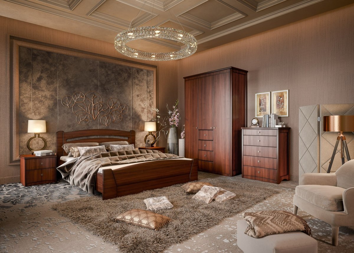 Спальня в классическом стиле с коричневой мебелью