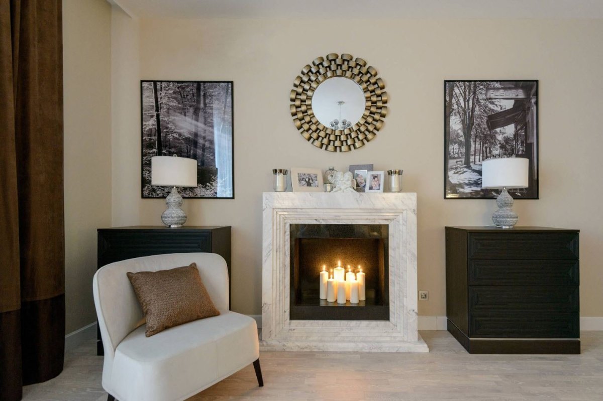 Камин со свечами в интерьере гостиной