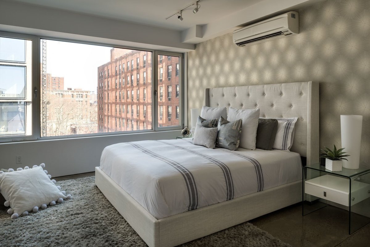 Окно над кроватью в спальне