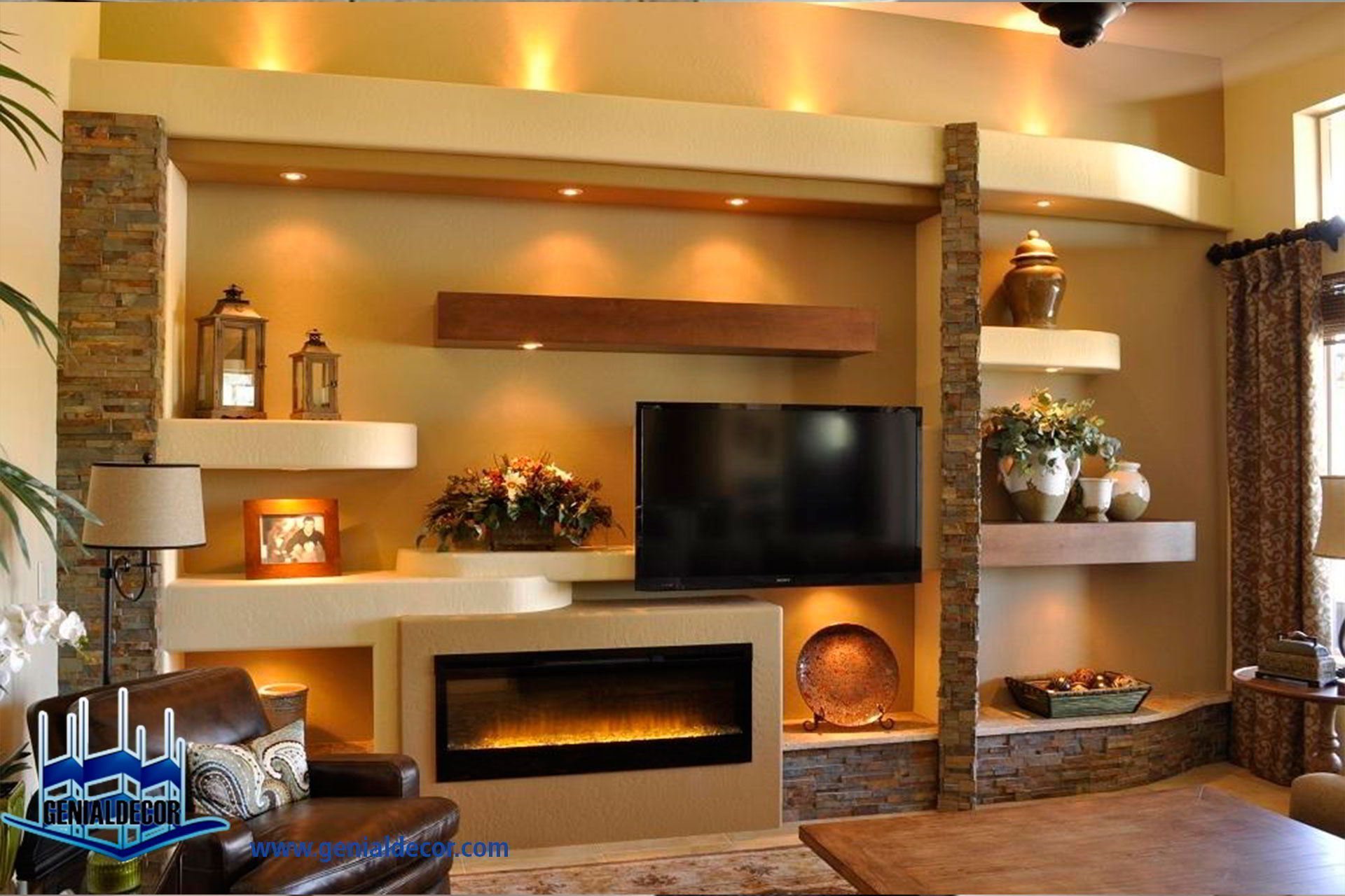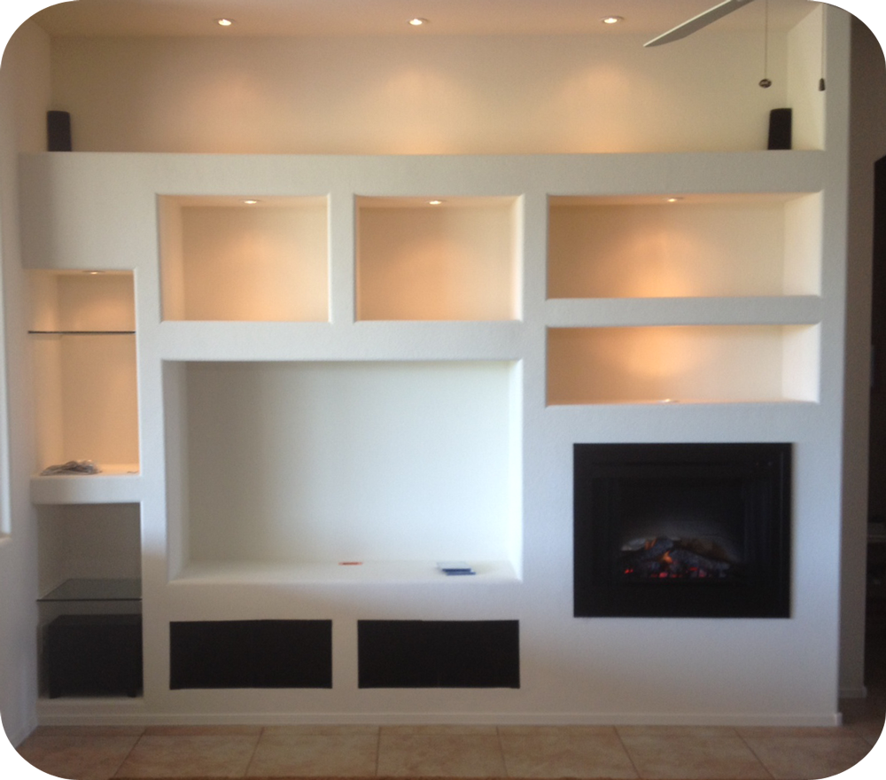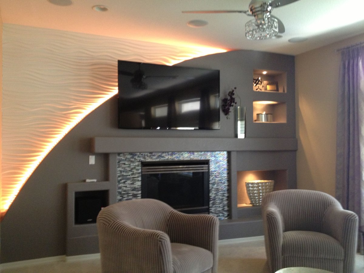 Стенка из гипсокартона под телевизор с камином