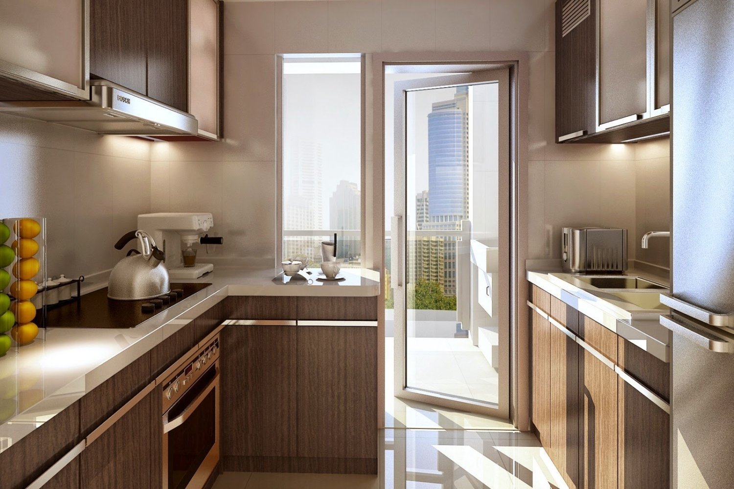 Интерьер узкой кухни с балконом