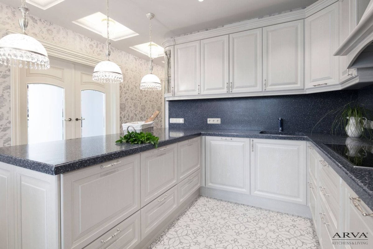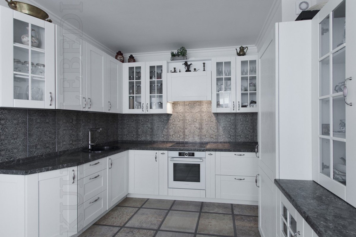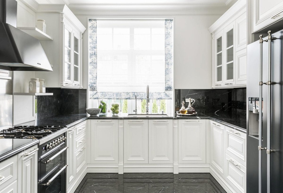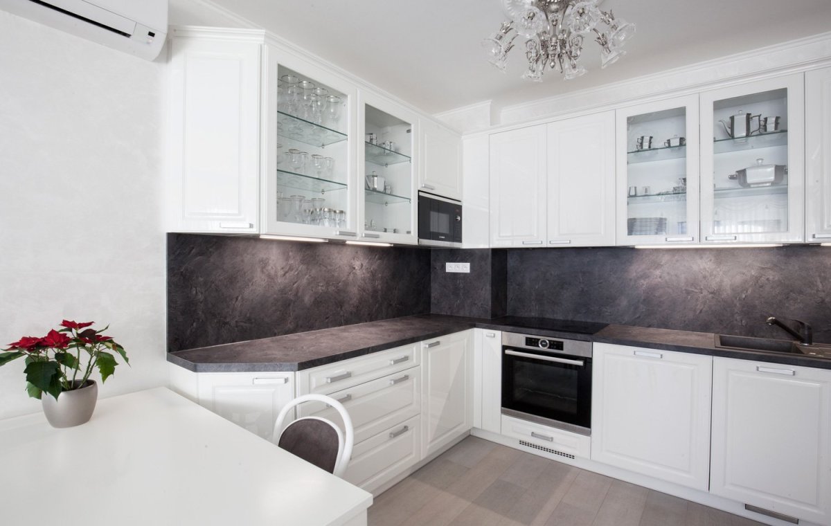 Белая кухня с черной столешницей