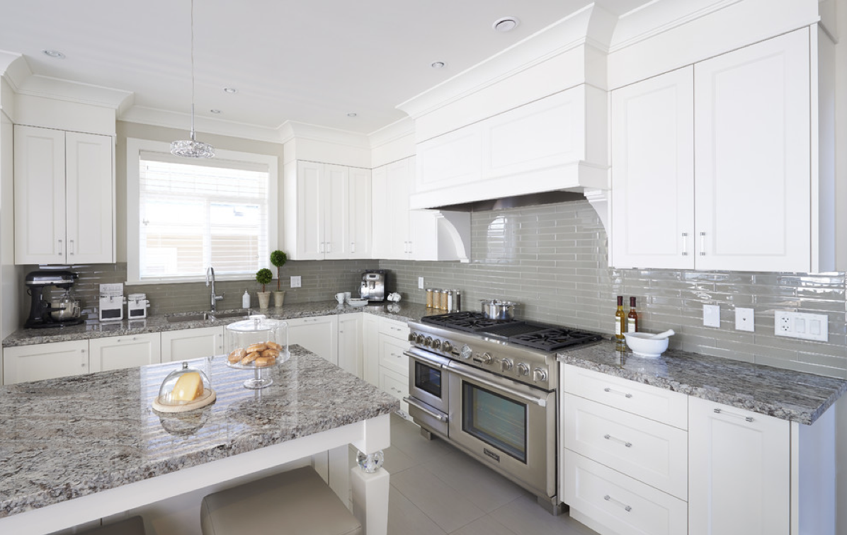 Белая кухня с серой столешницей