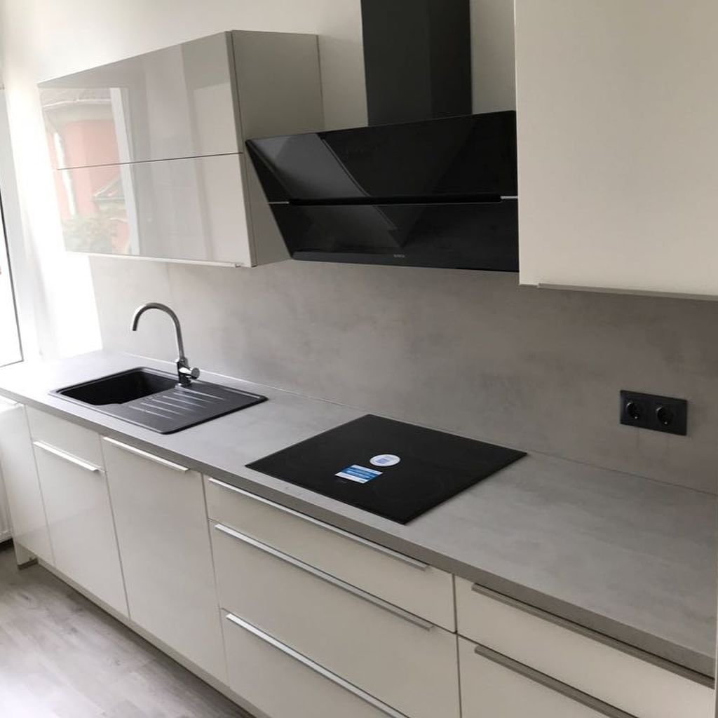 Светло серая кухня с темной столешницей