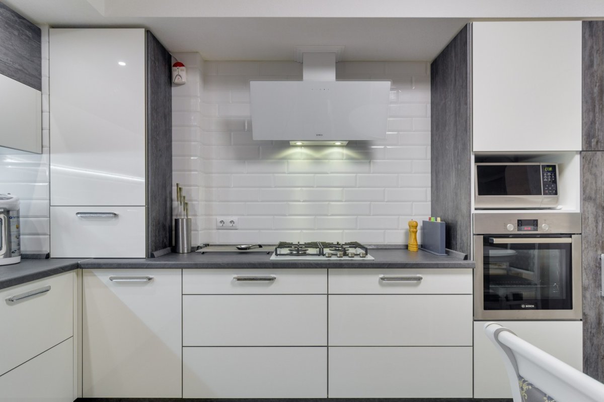 Белая кухня с серым фартуком