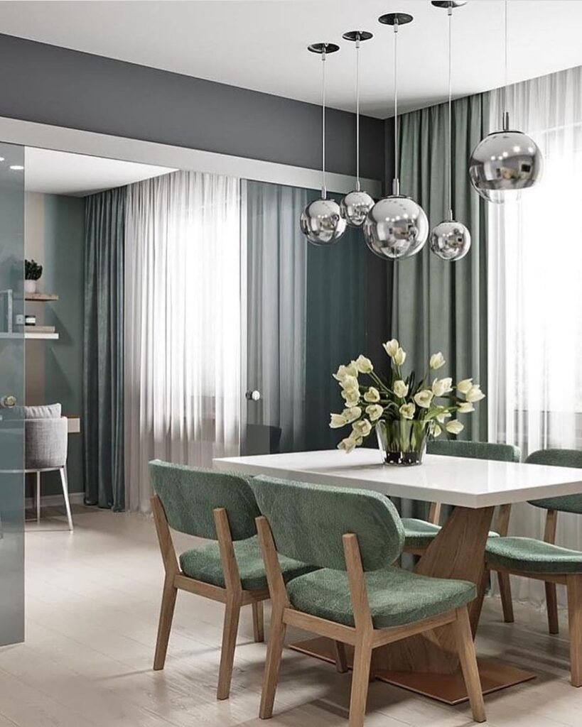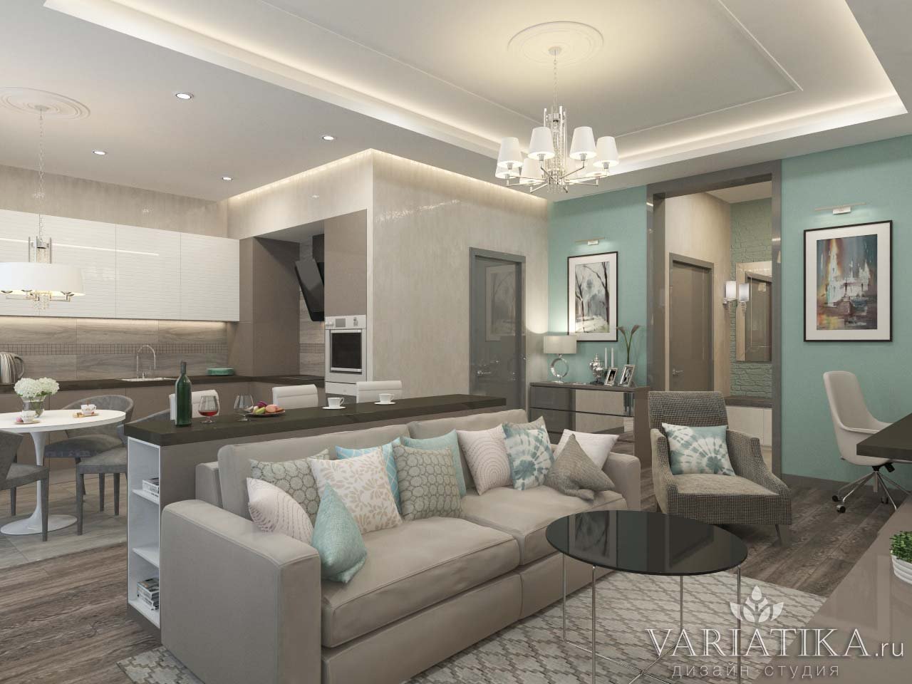 Серо зеленая кухня гостиная