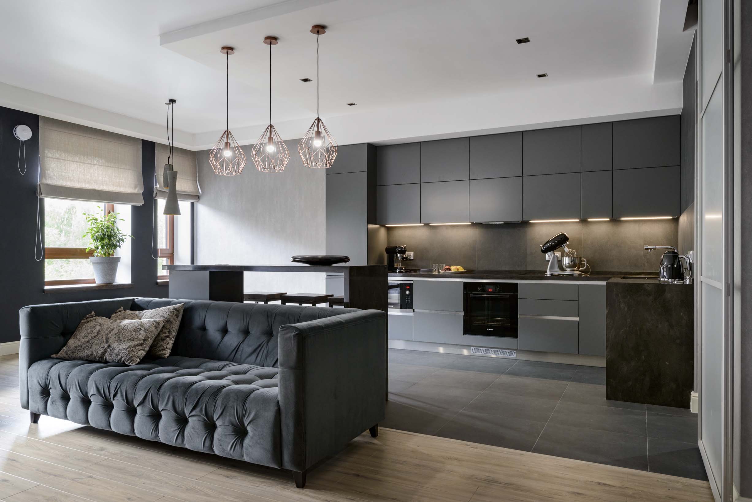 Кухня гостиная в серо черных тонах