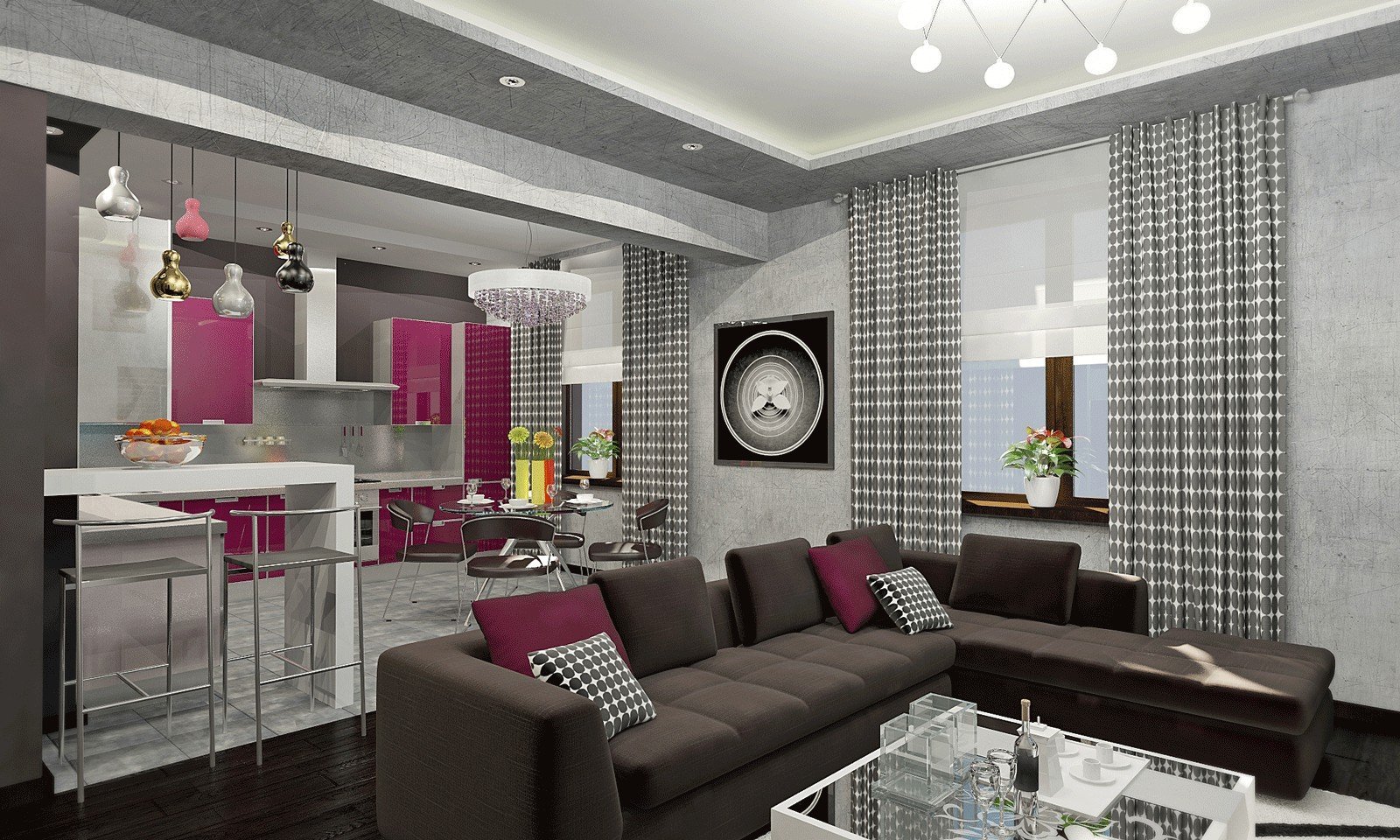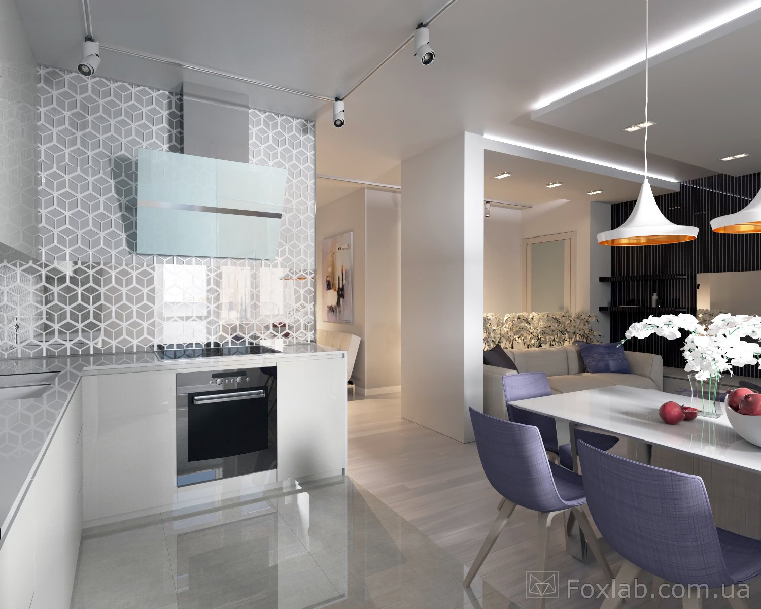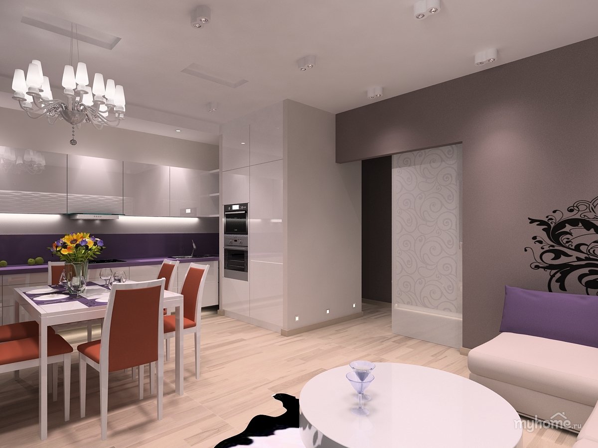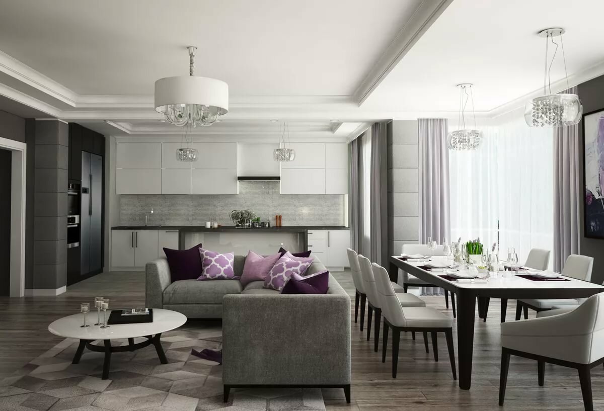 Кухня фиолетовая -гостиная серо-белая