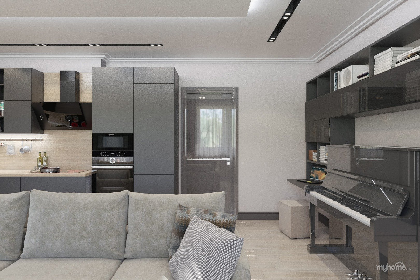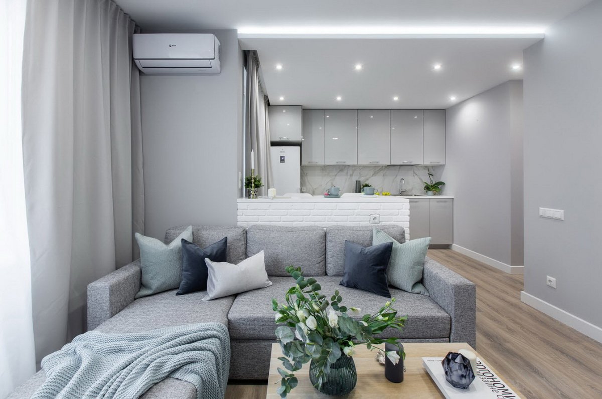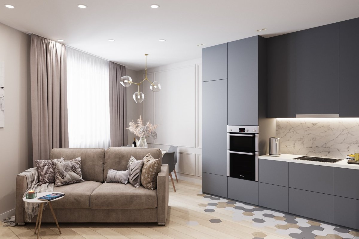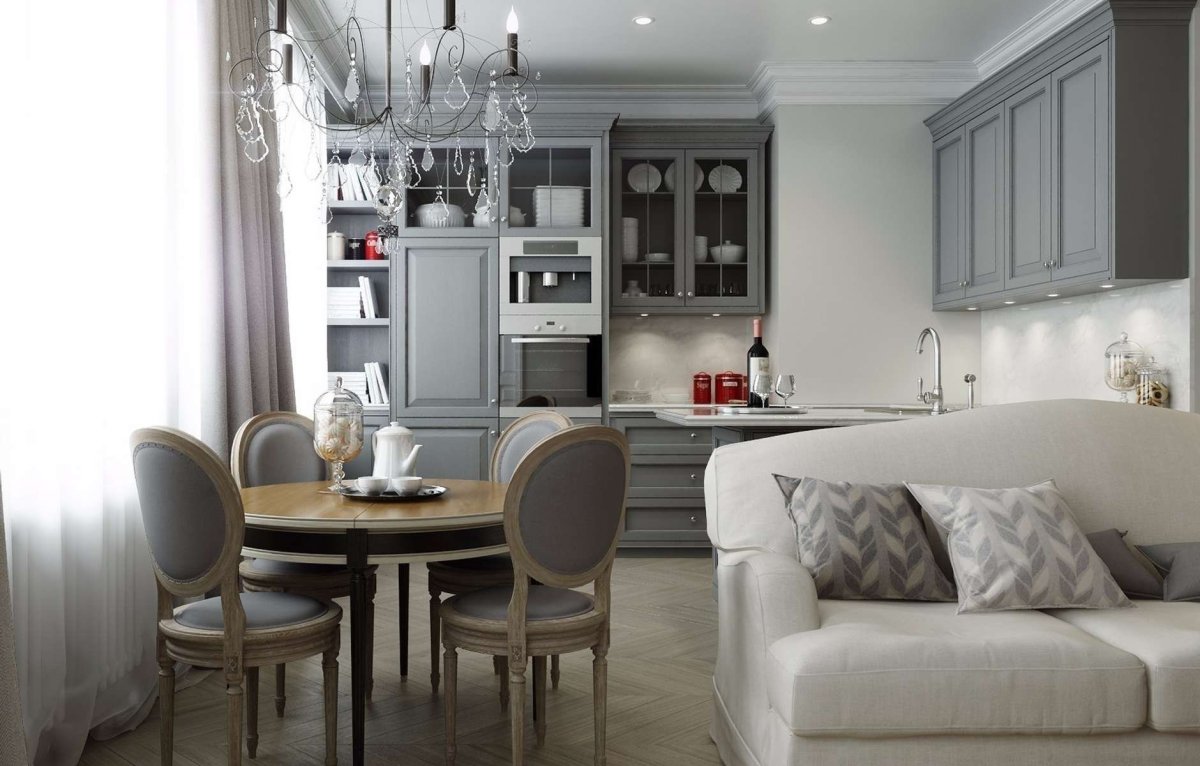 Кухня гостиная с серой кухней