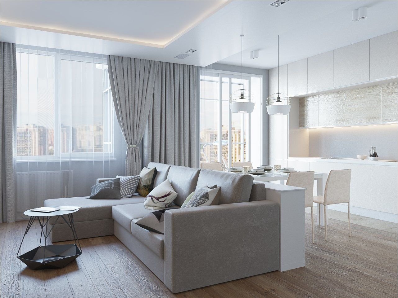 Бело серая кухня гостиная