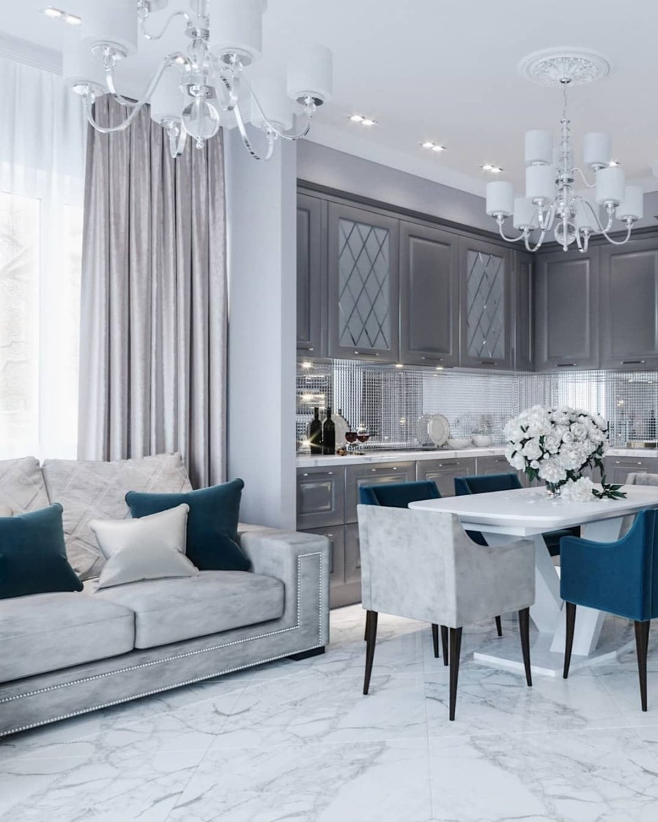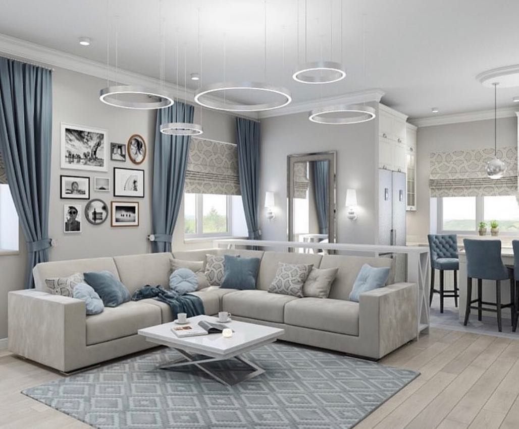 Кухня гостиная в серо голубых тонах