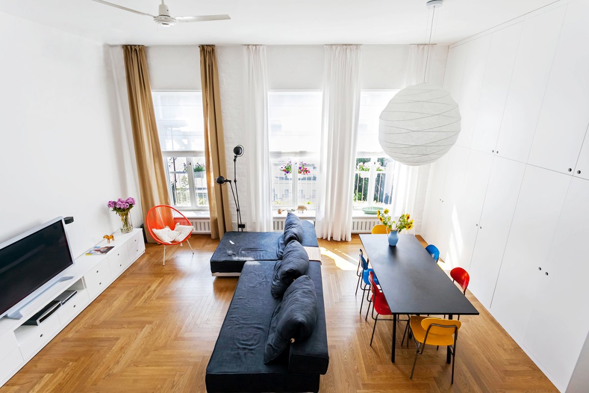Квартира с высокими потолками и большими окнами