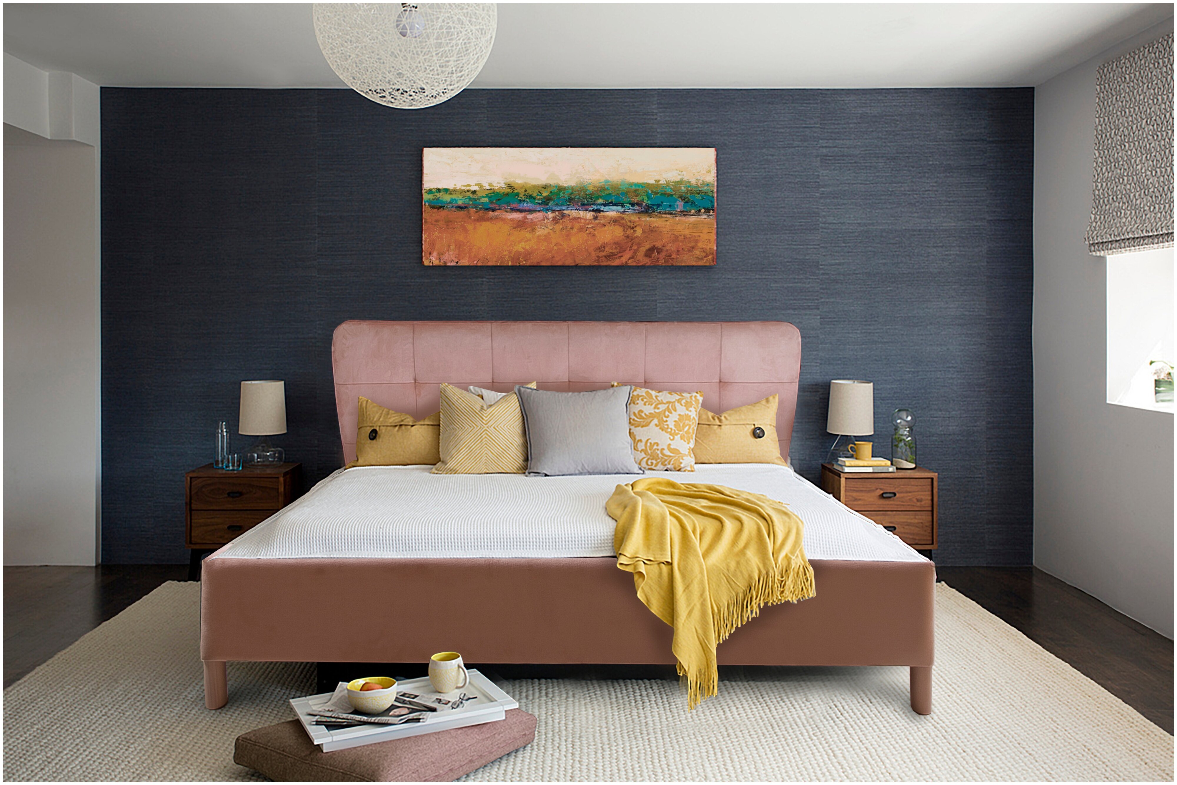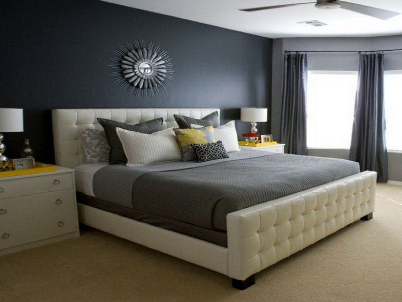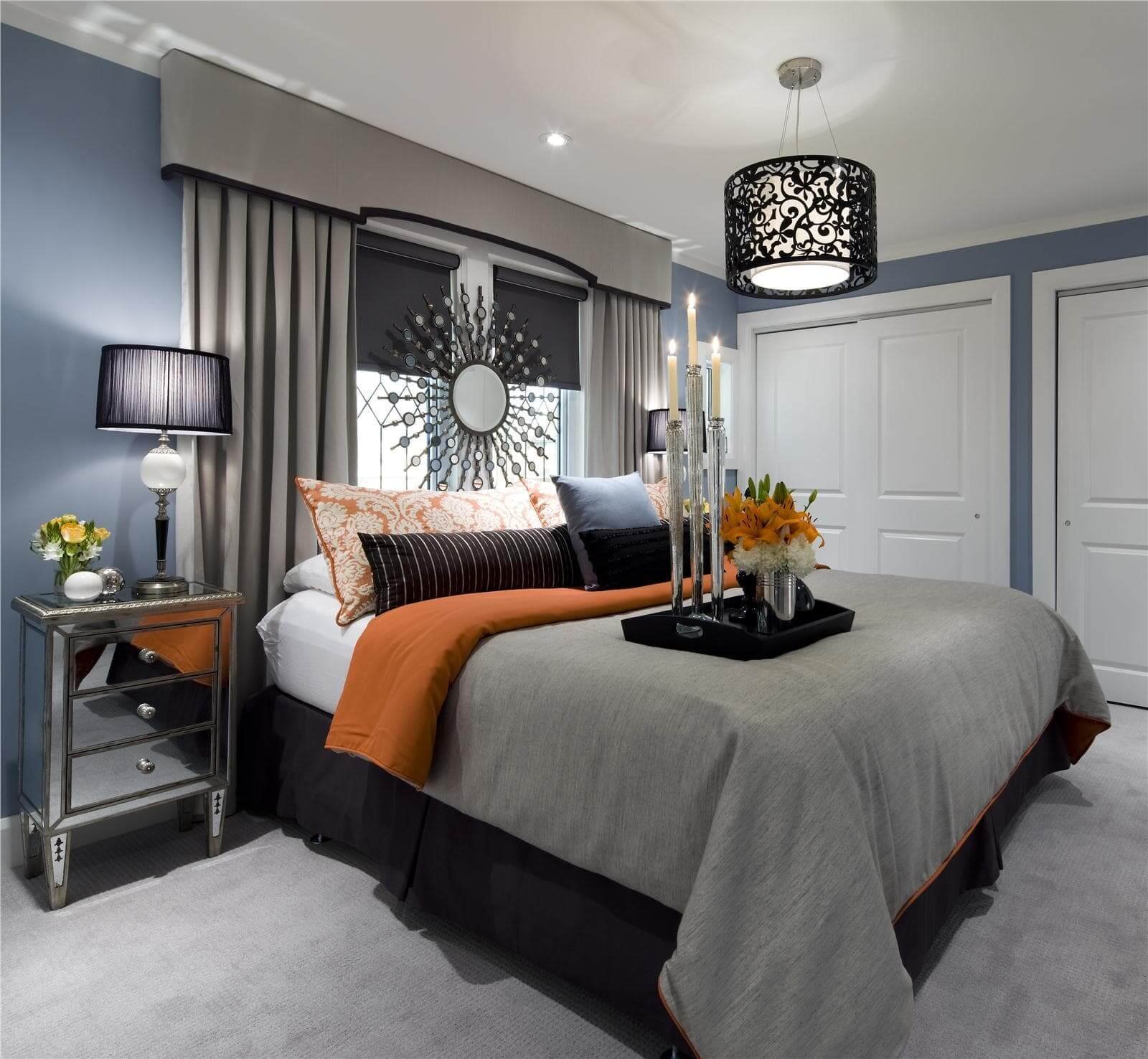 Серая спальня с яркими акцентами