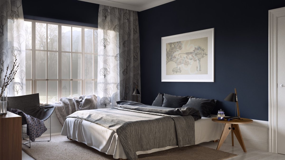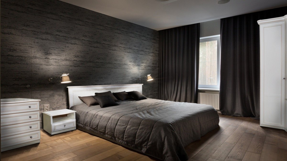 Спальня с темными стенами