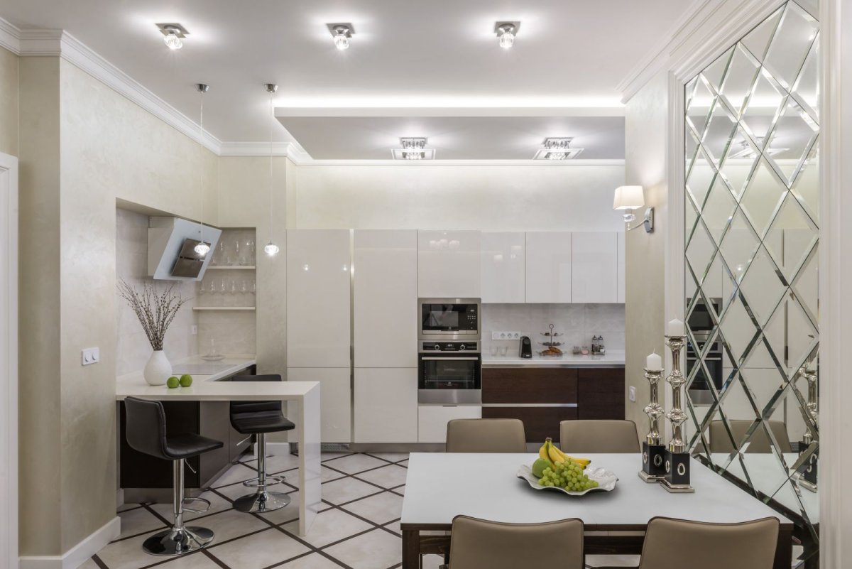 Зеркальная плитка на кухне в обеденной зоне
