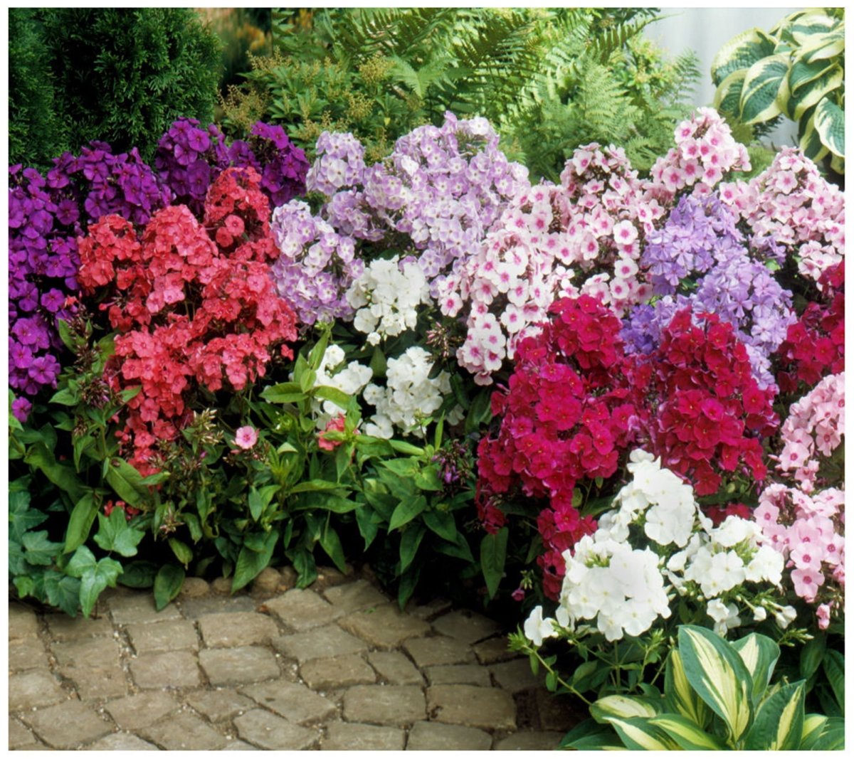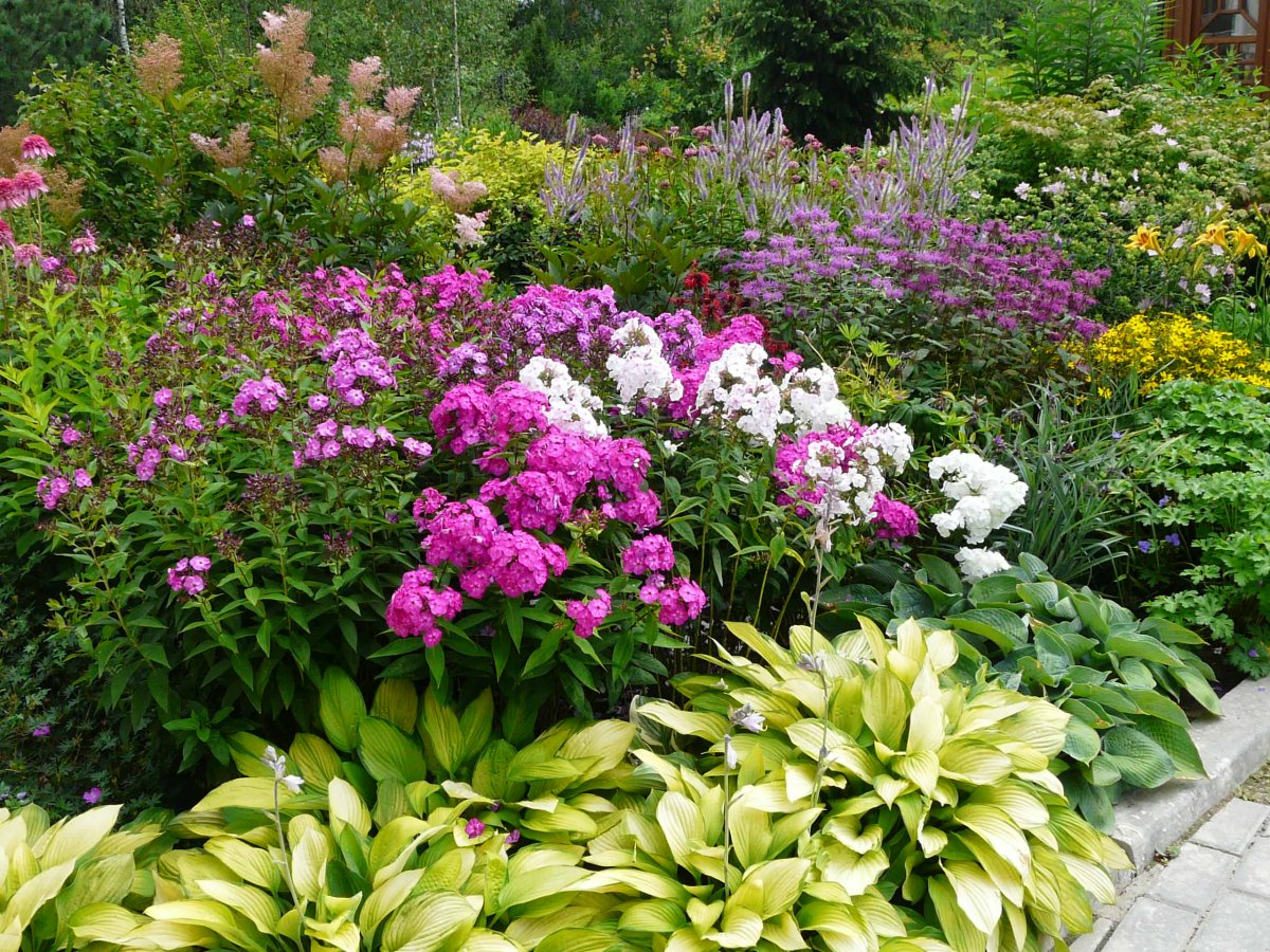 Клумба с флоксами, пионом и хостой
