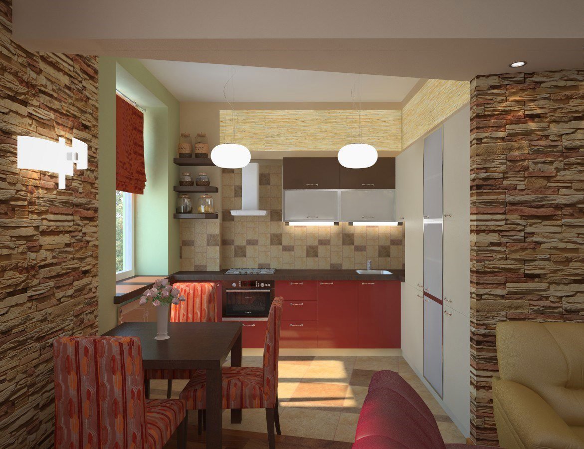 Декоративный камень в интерьере гостиной объединенной с кухней