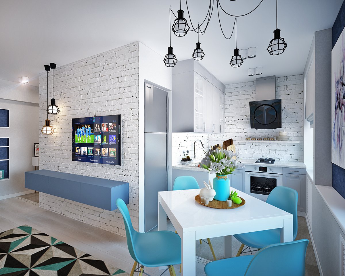 Белый кирпич в интерьере гостиной совмещенной с кухней