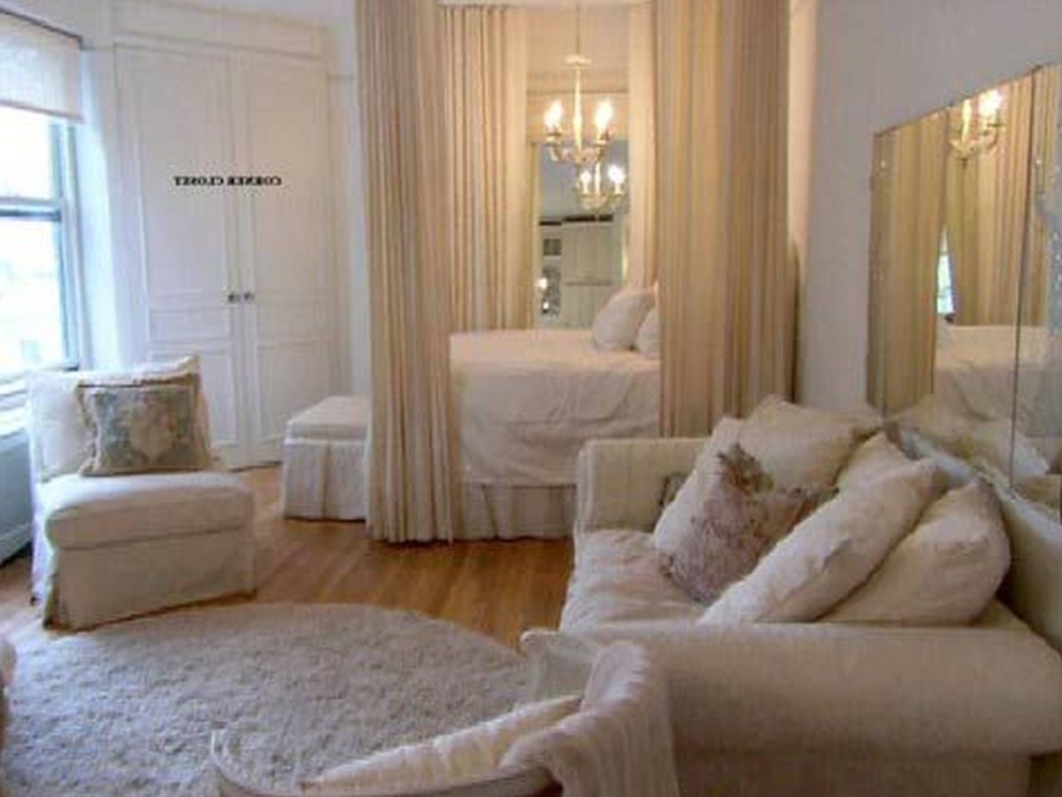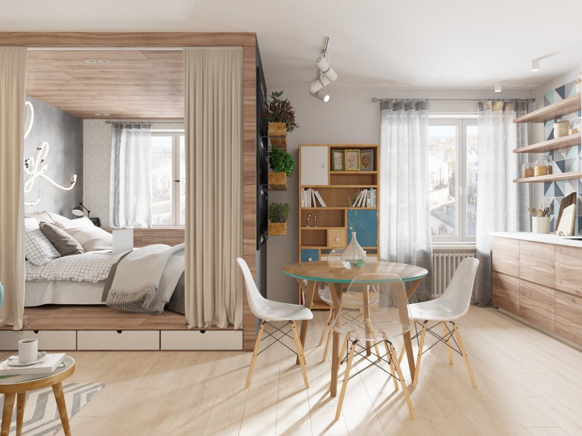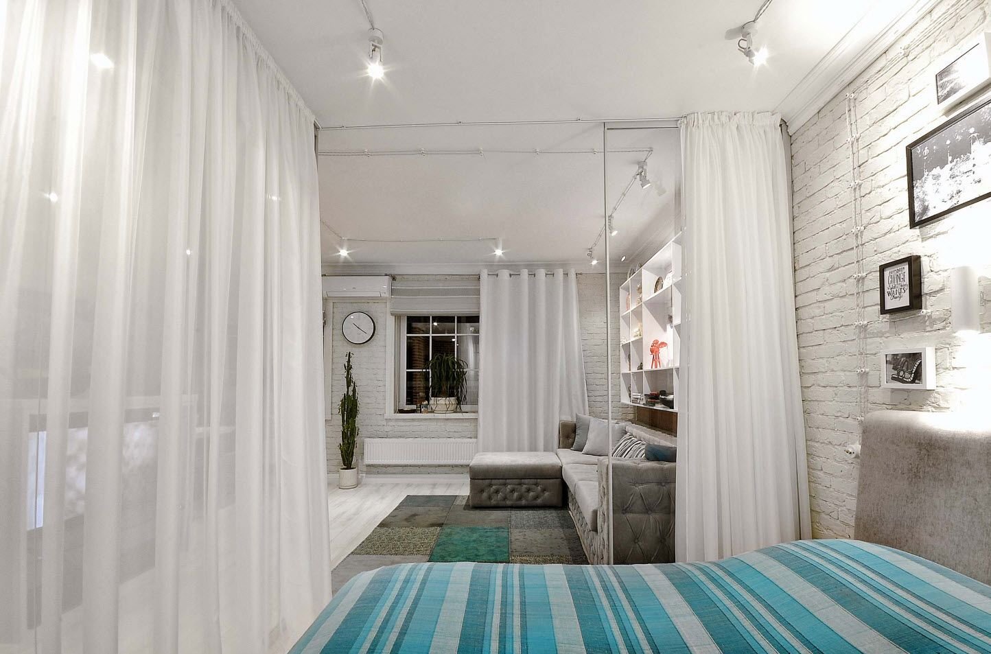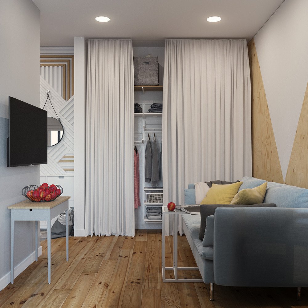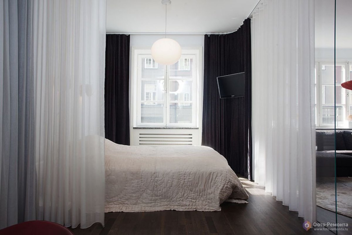 Квартира студия зонирование шторами