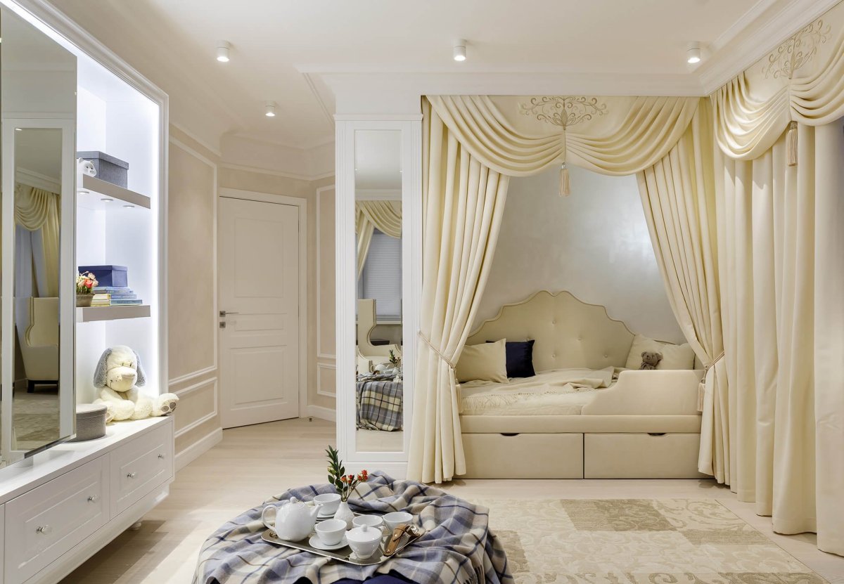 Кровать за шторой в гостиной