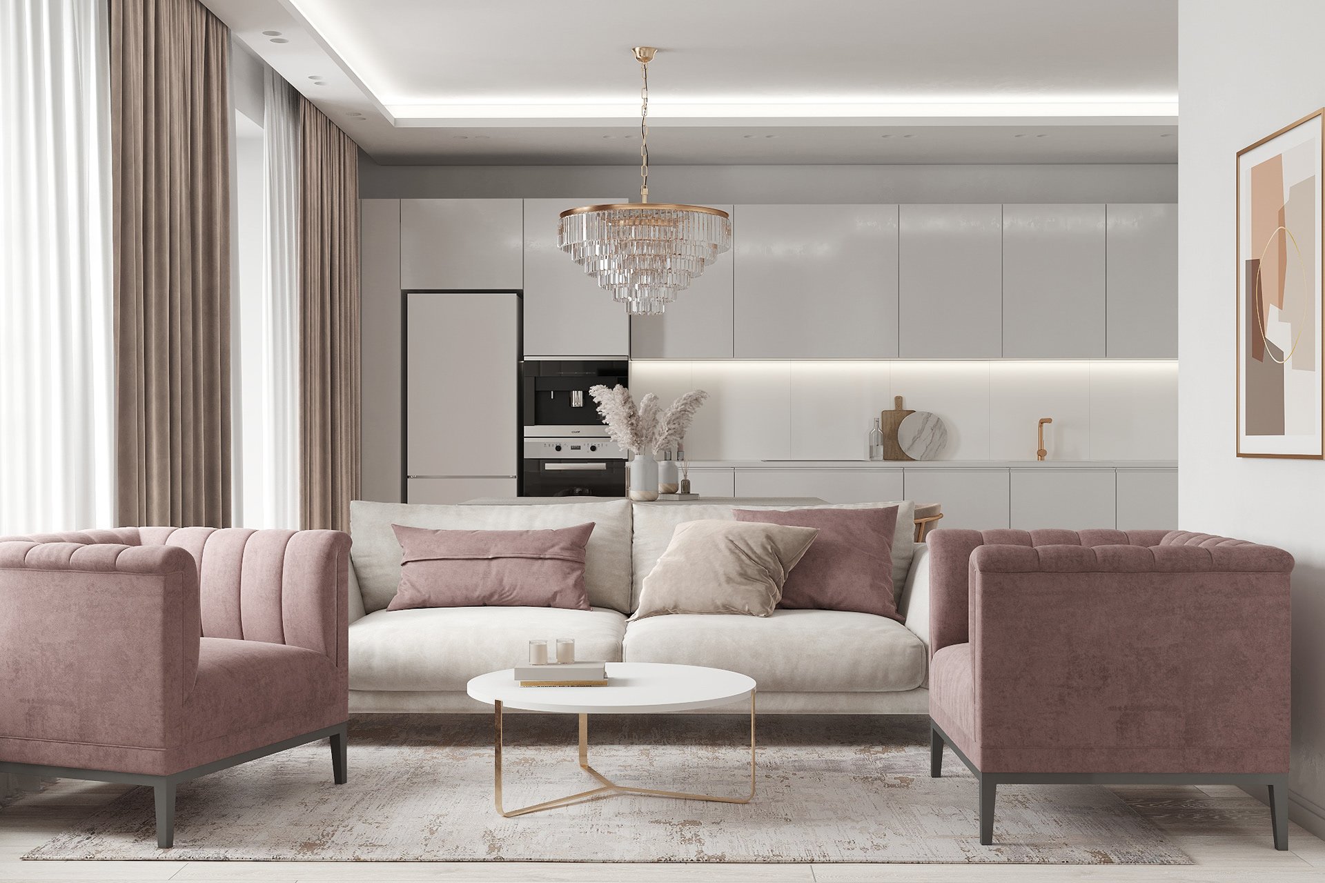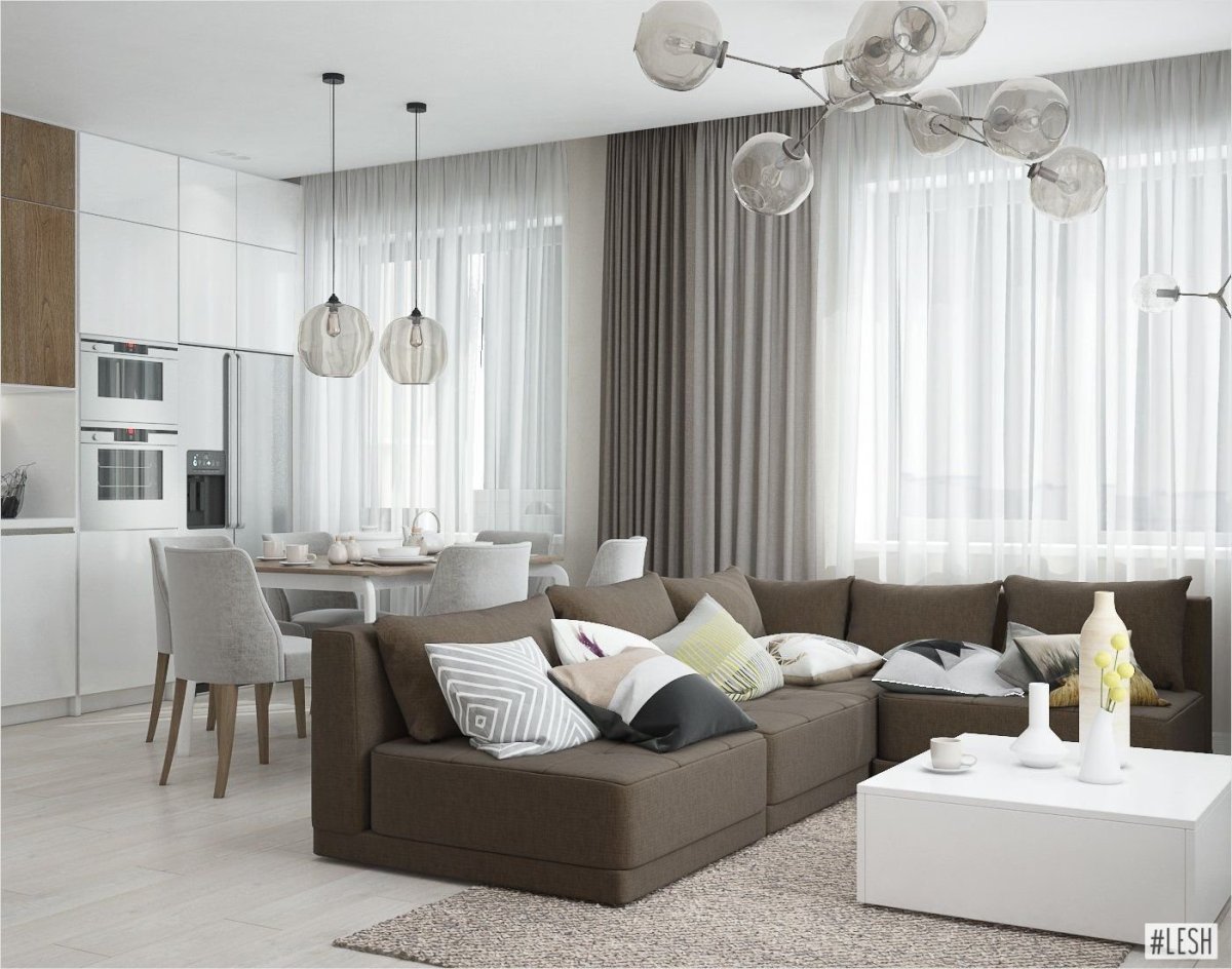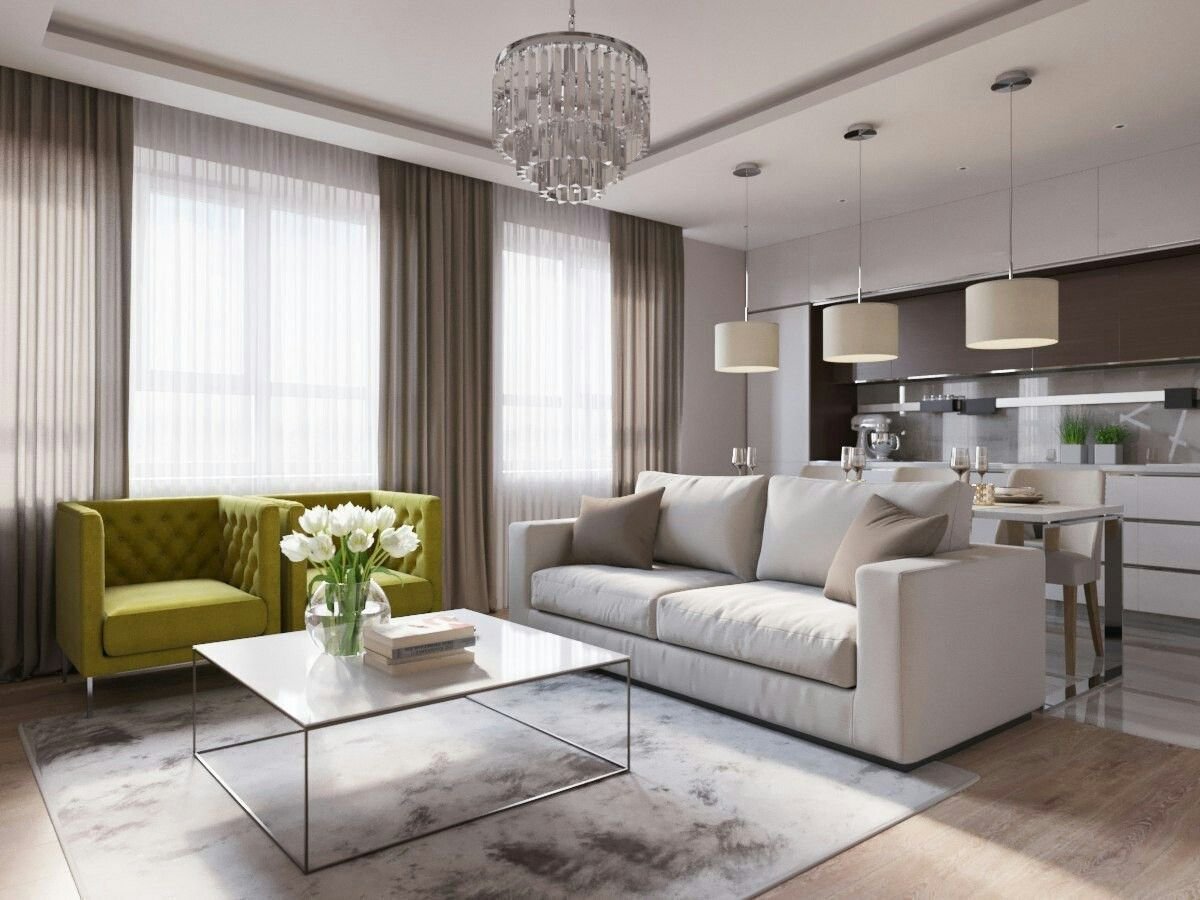 Гостиная совмещенная с кухней в светлых тонах