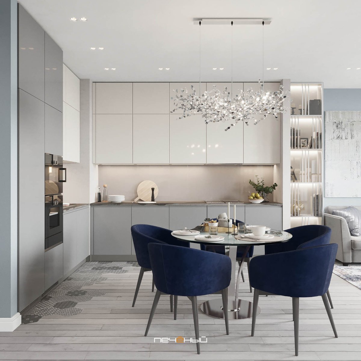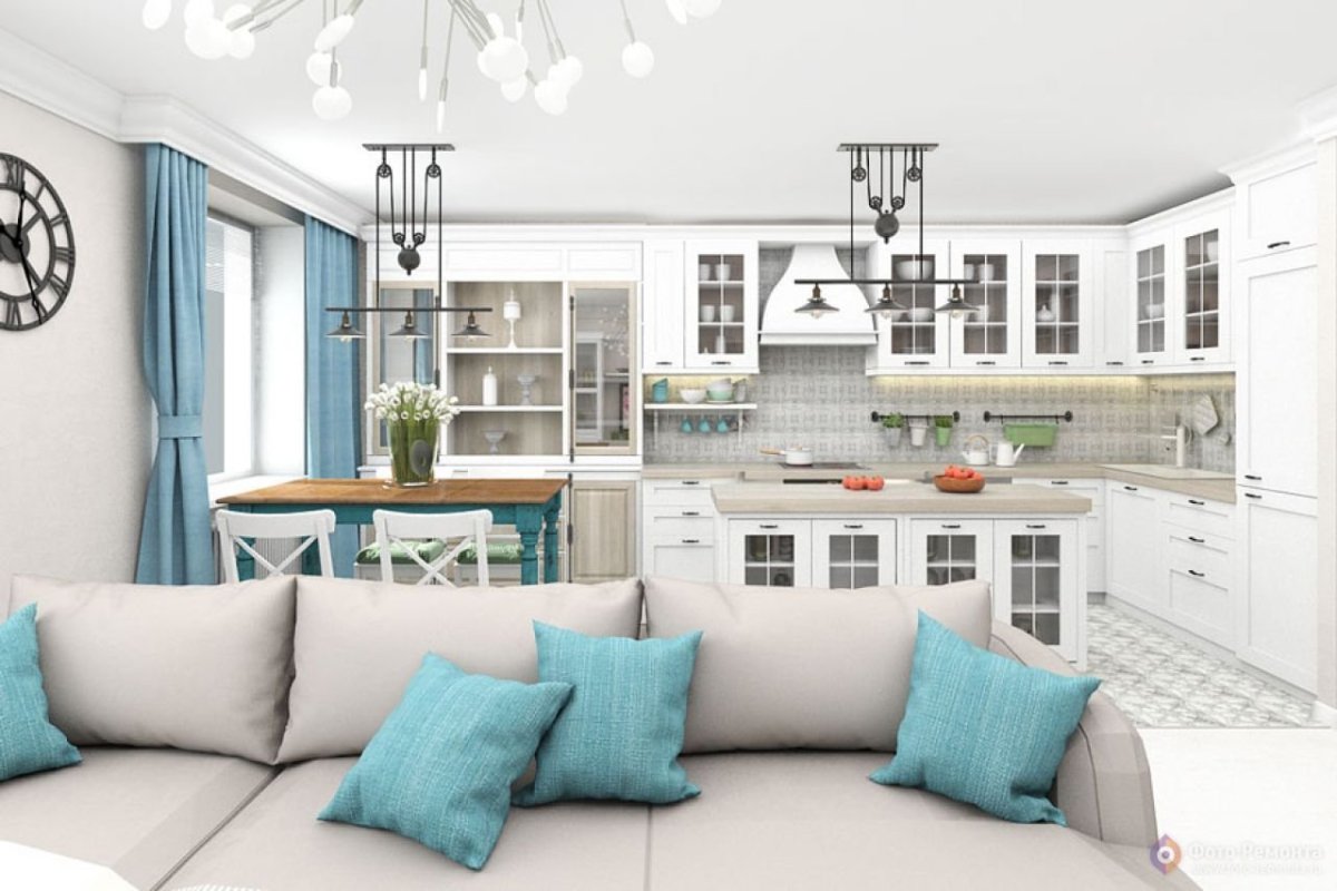 Бело голубая кухня гостиная
