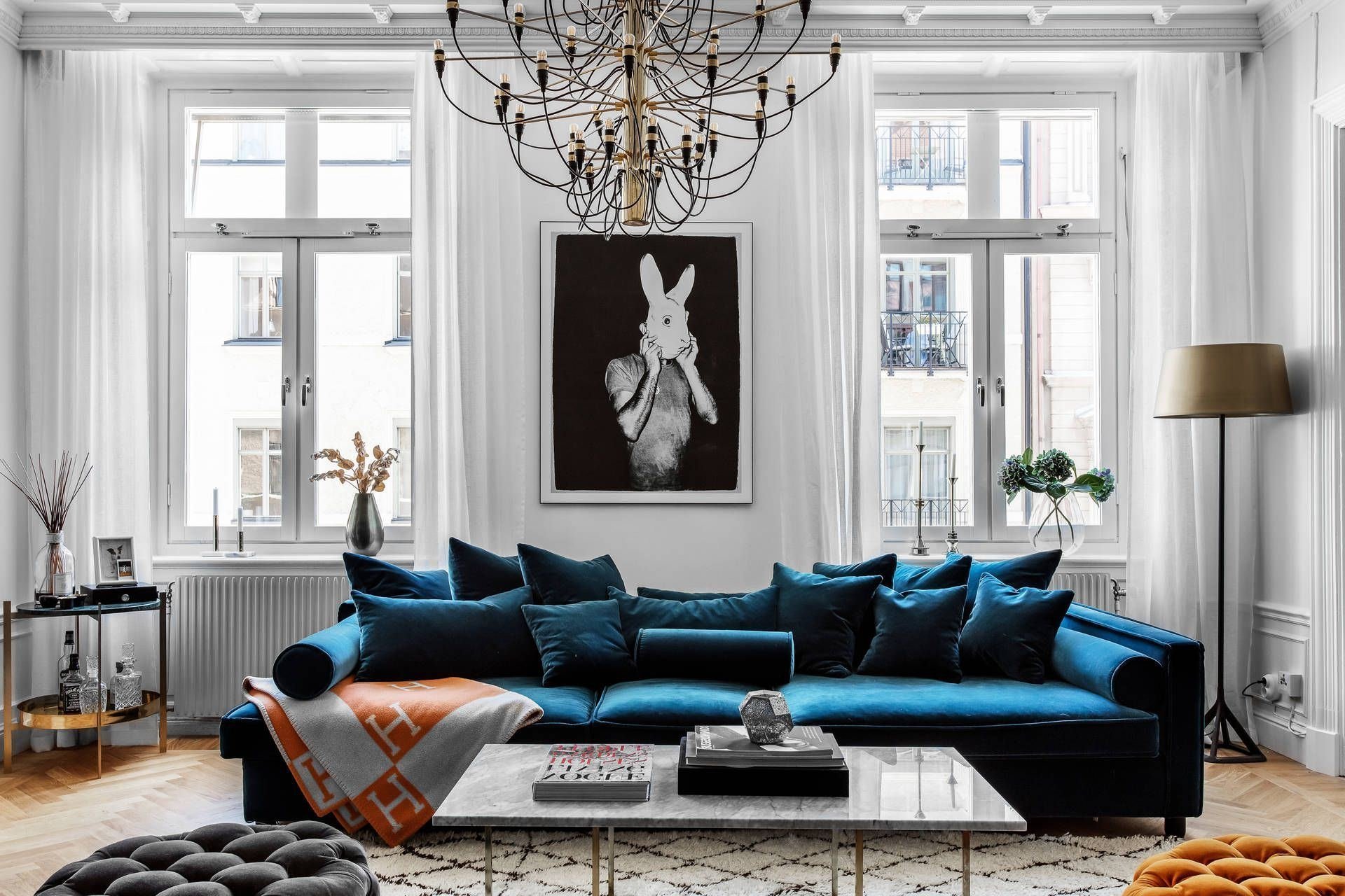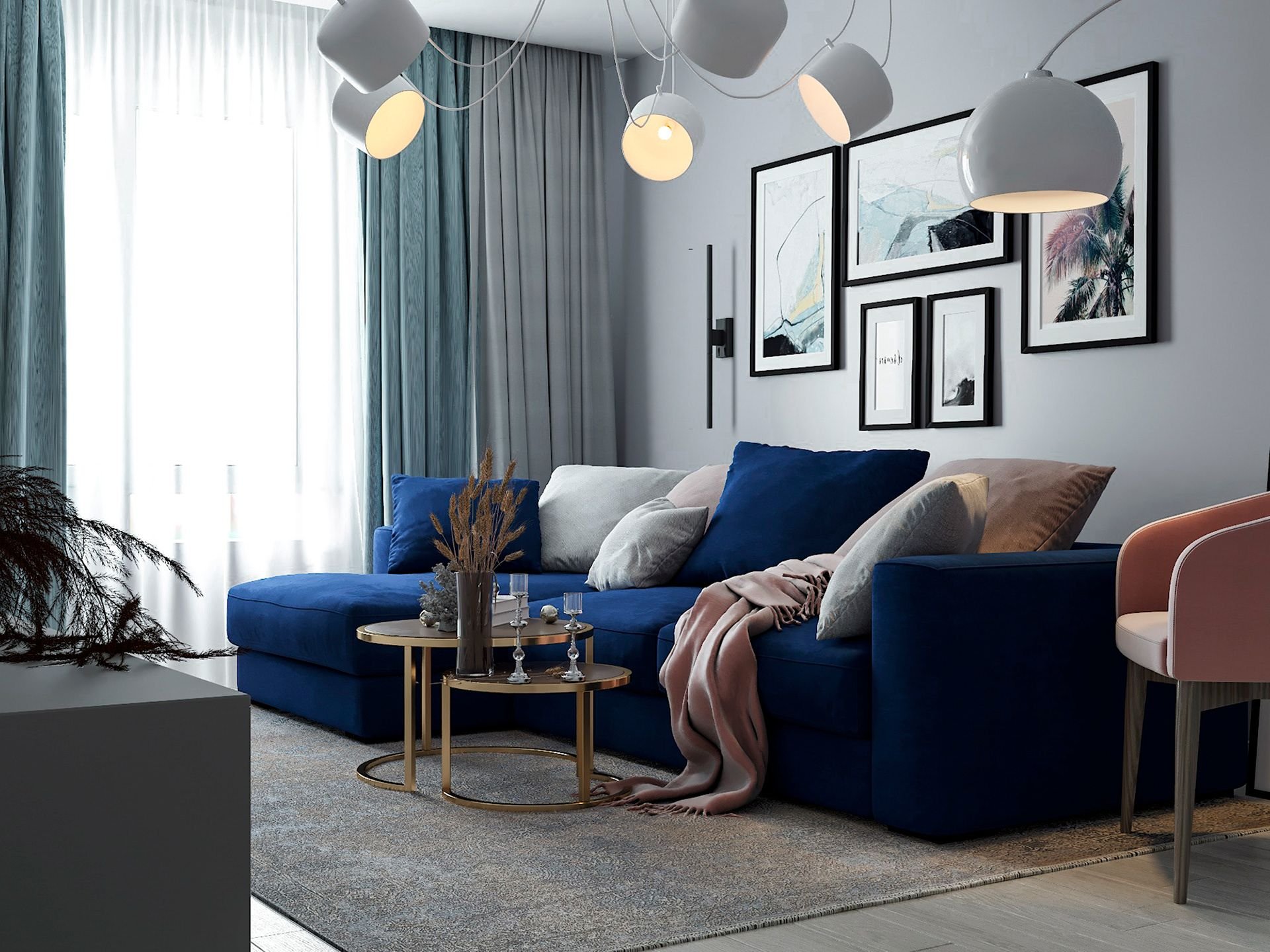 Гостиная в скандинавском стиле с синим диваном