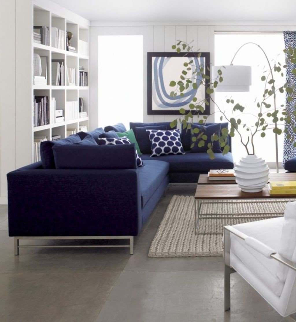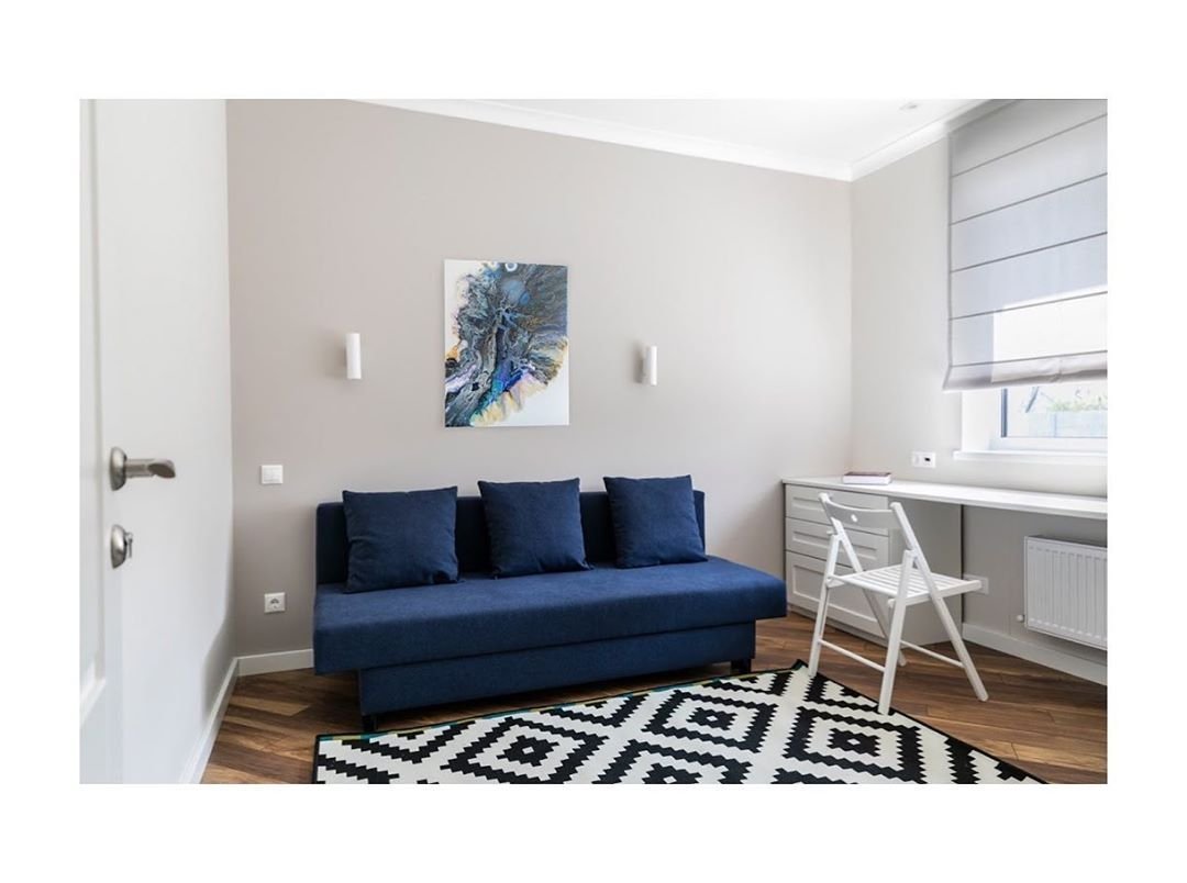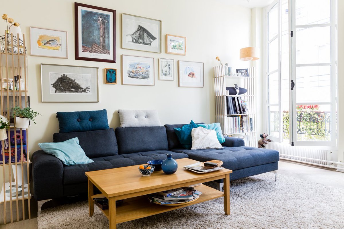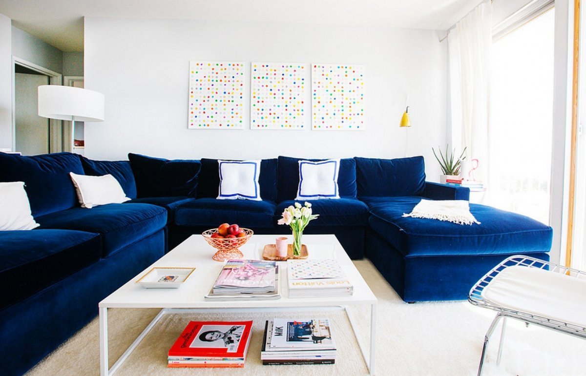 Белые стены синий диван