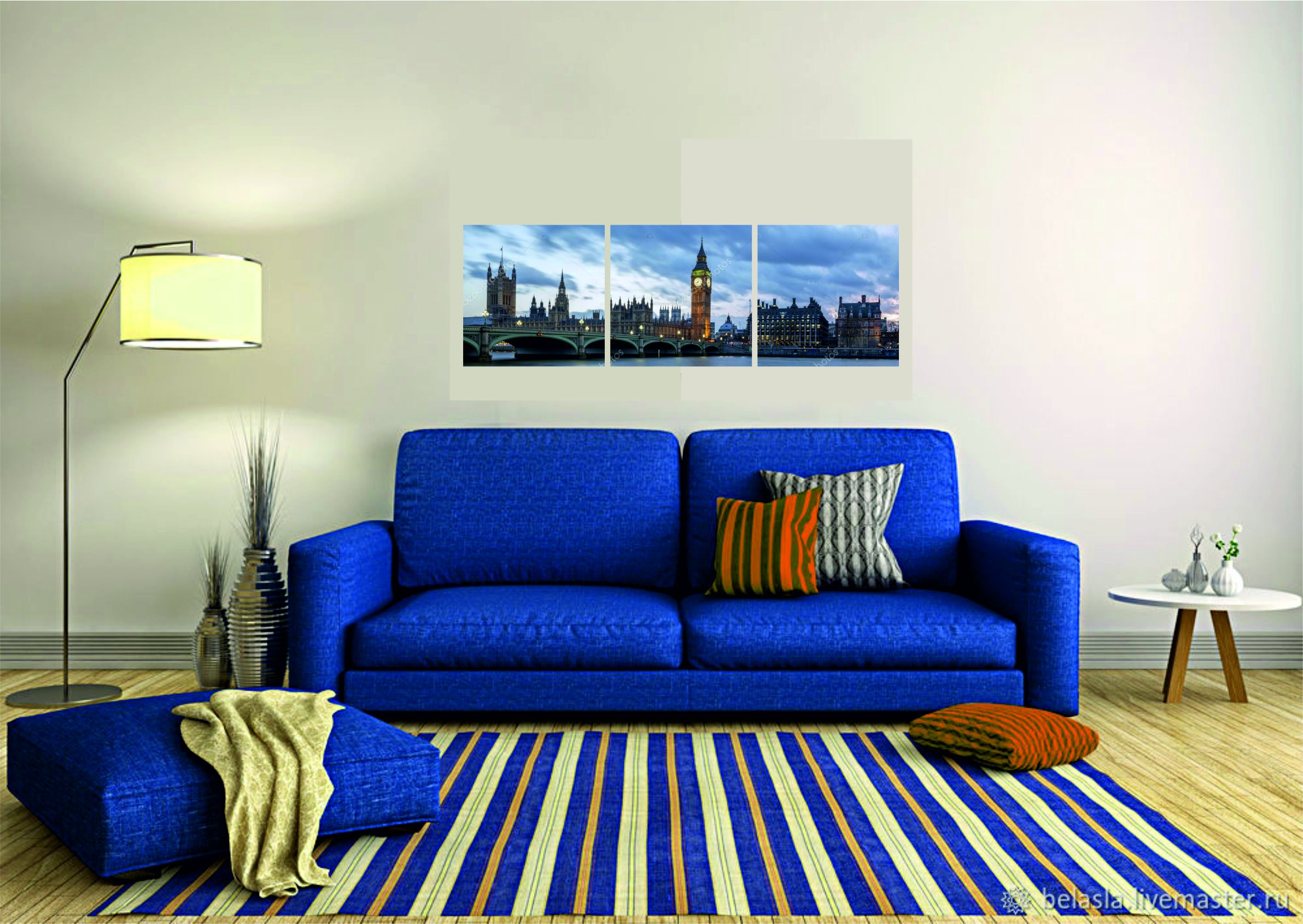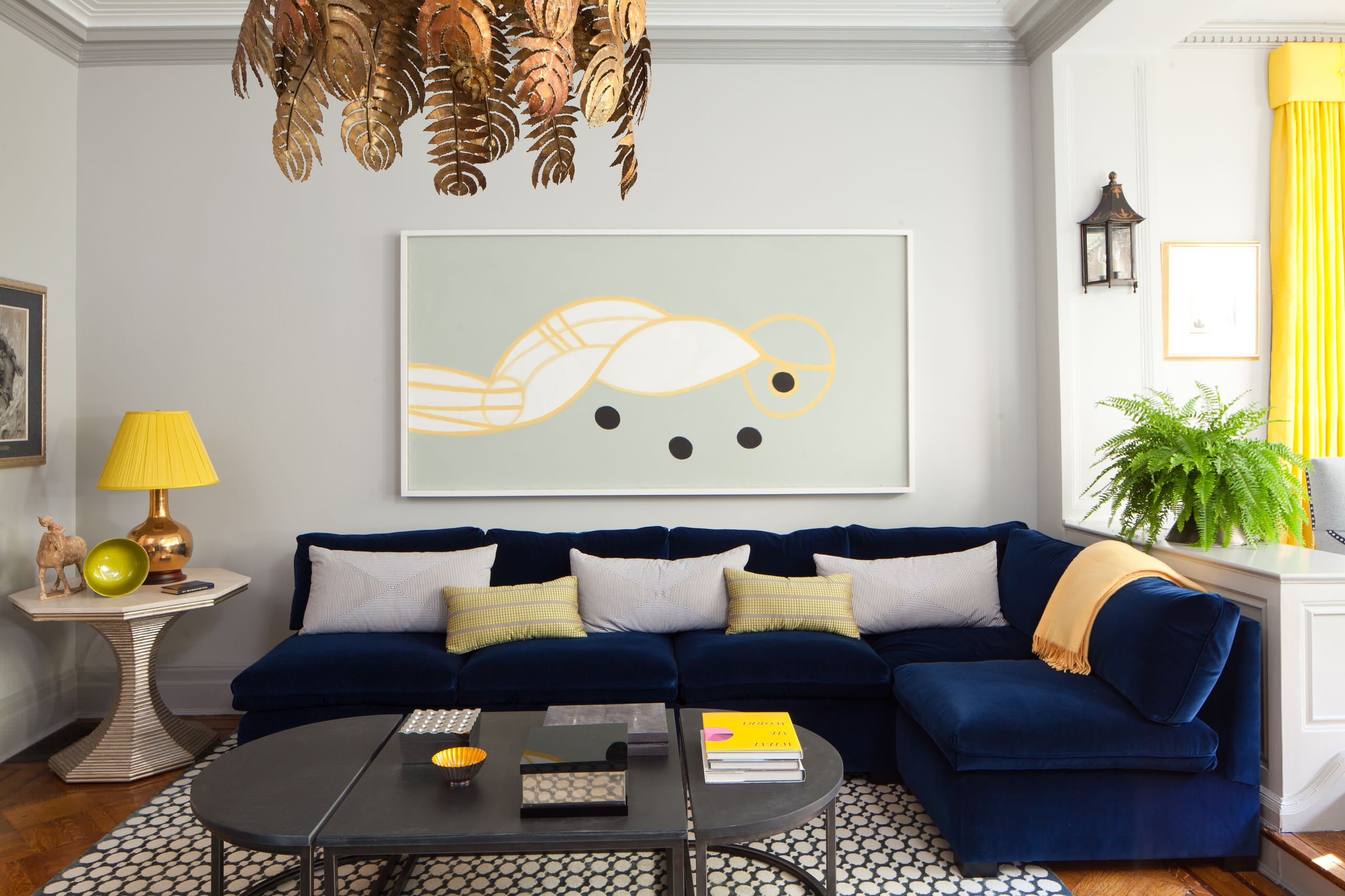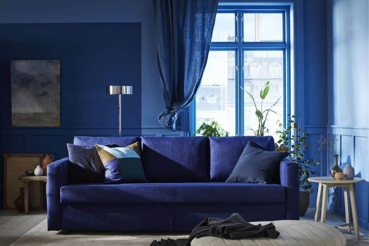 Белые стены синий диван