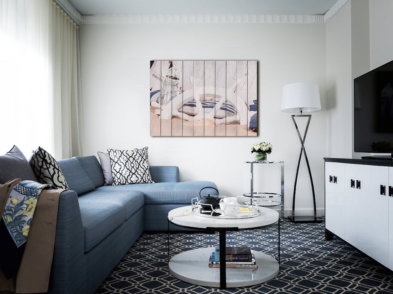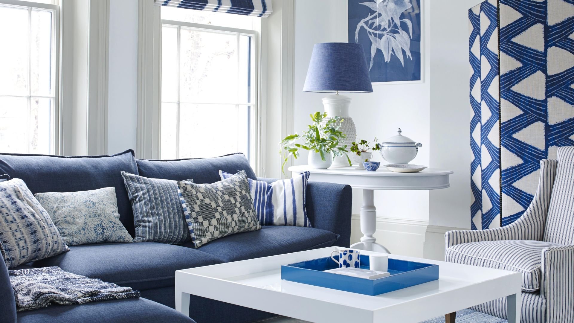 Белая гостиная с синим диваном