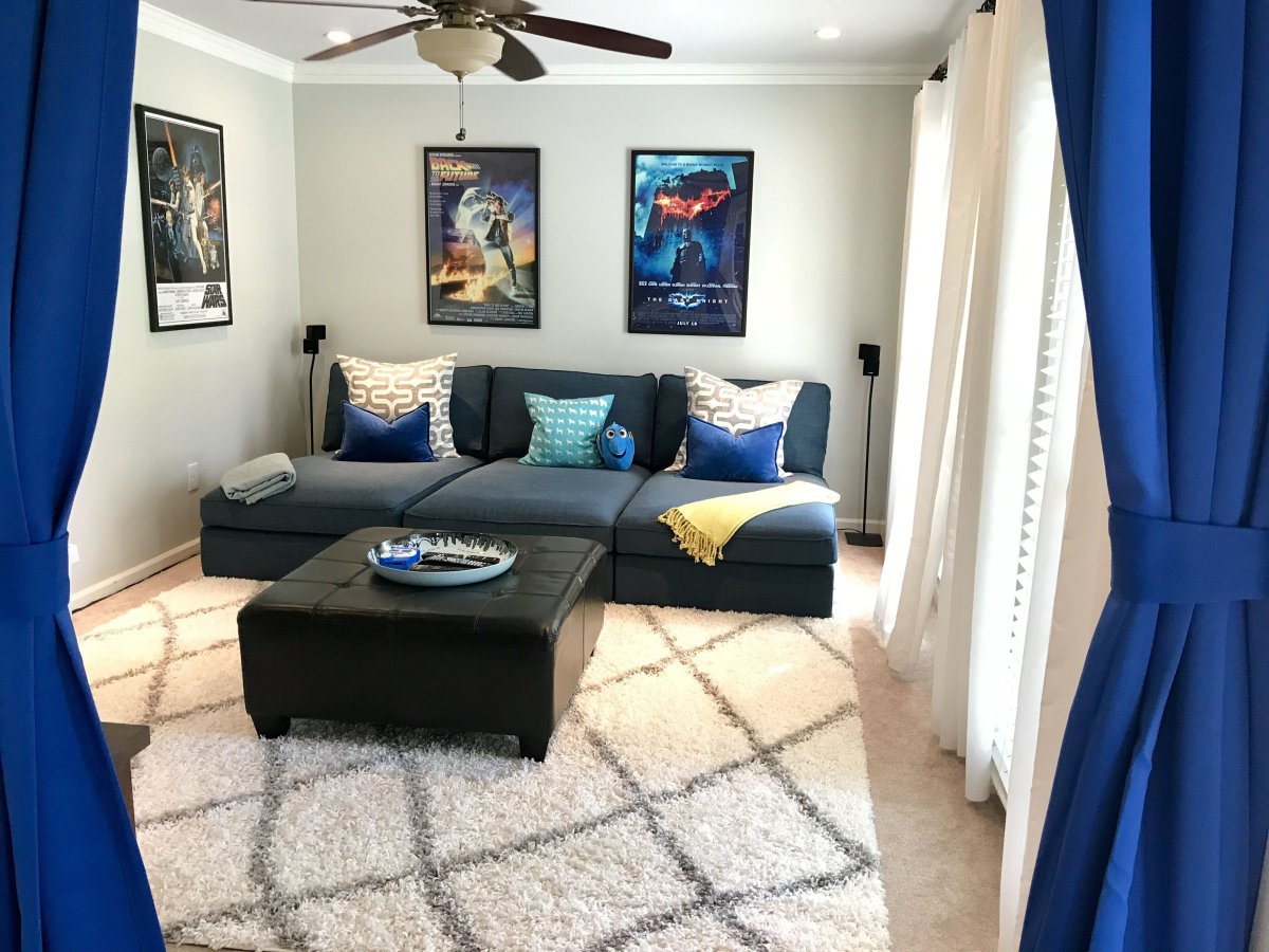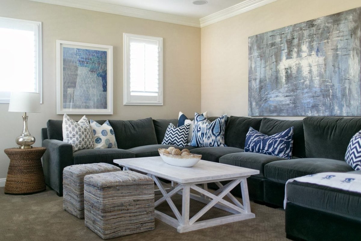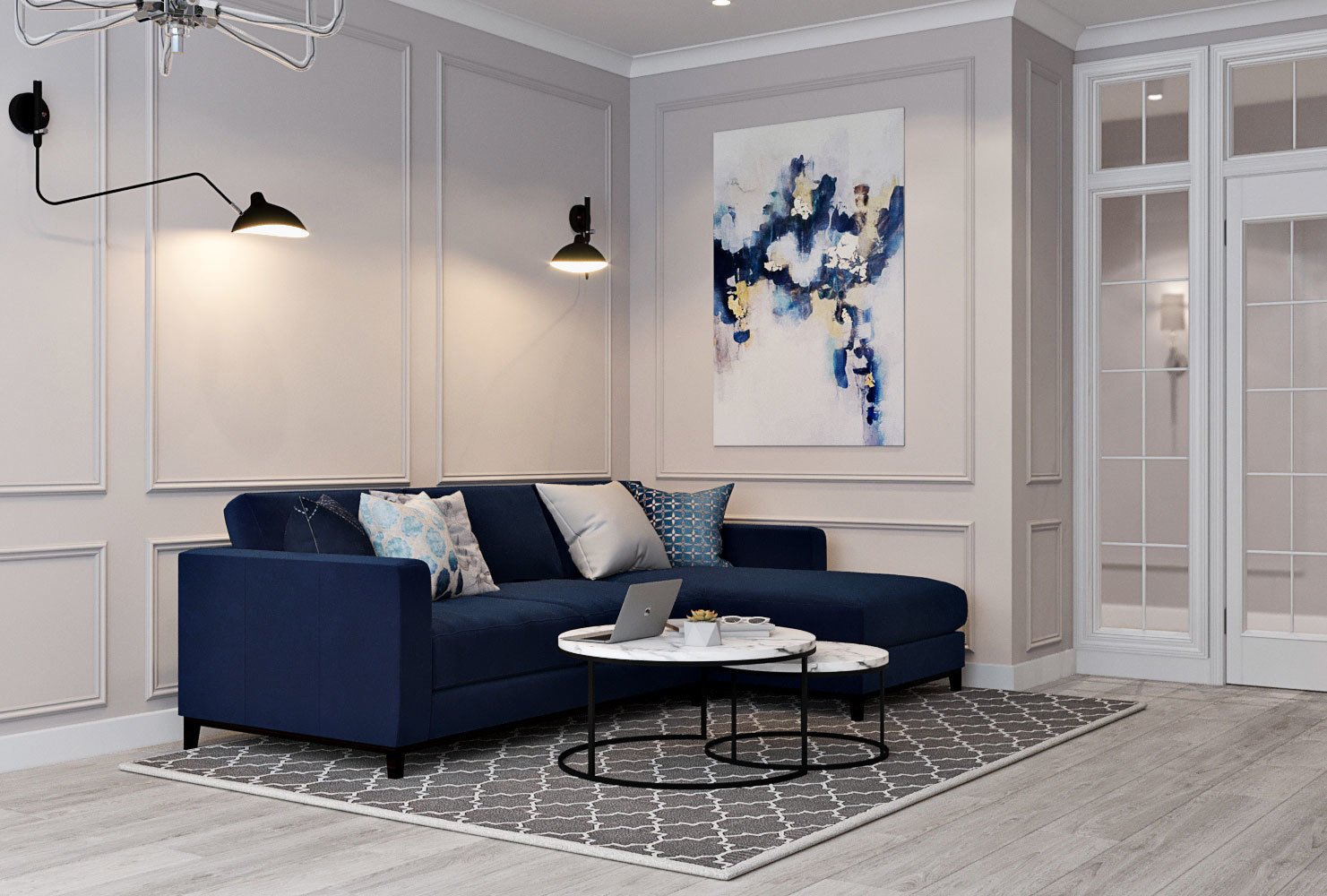 Серая комната с синим диваном