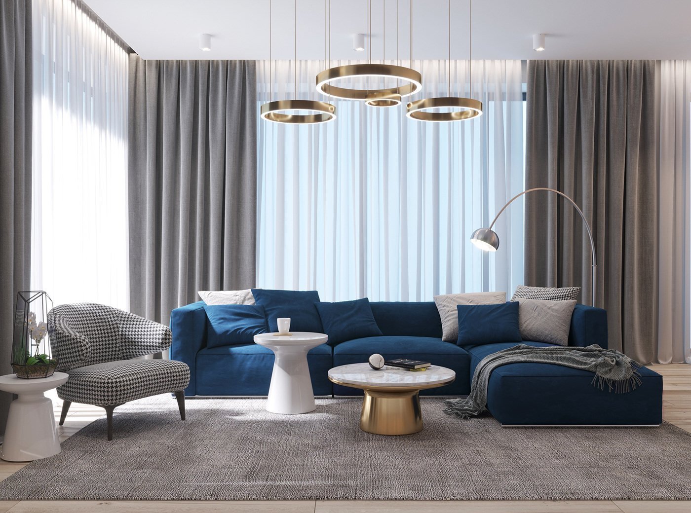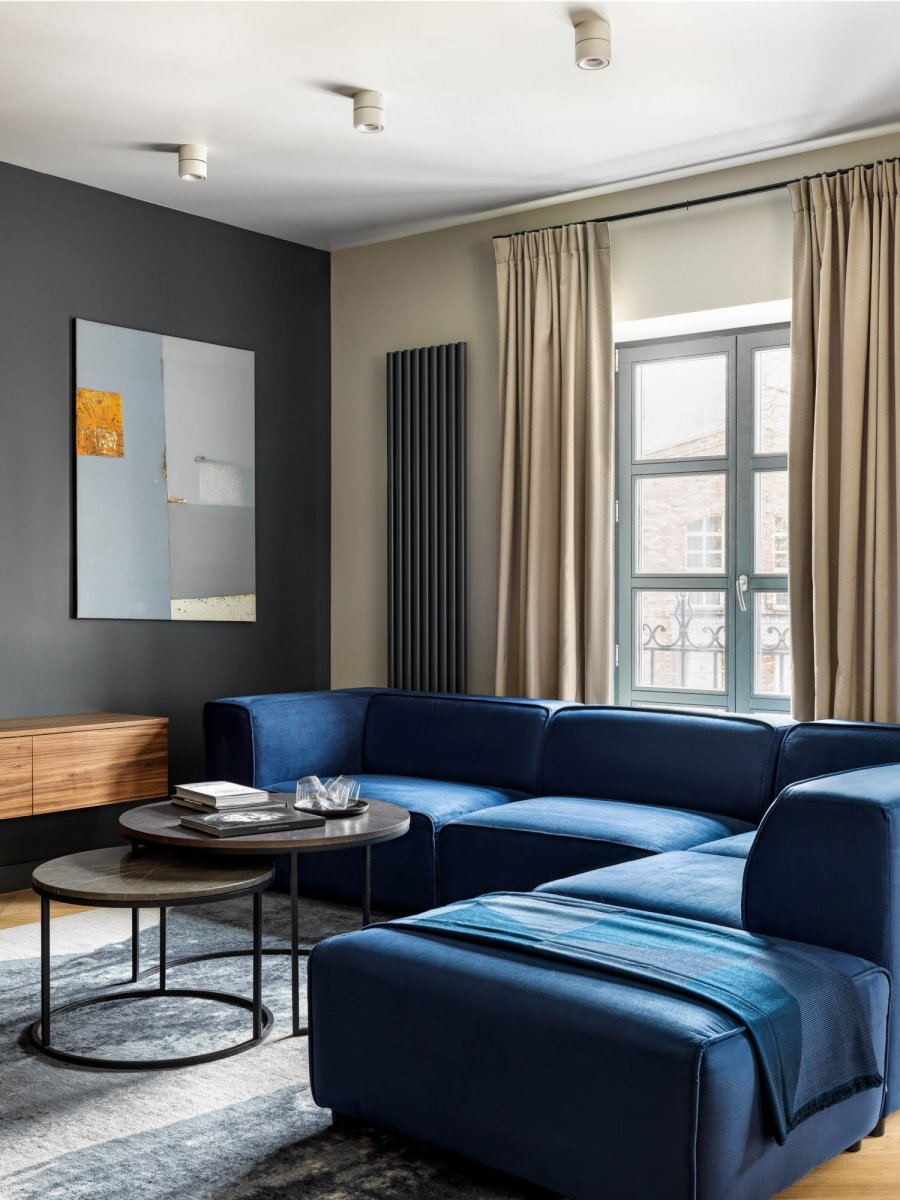 Синий диван в сером интерьере