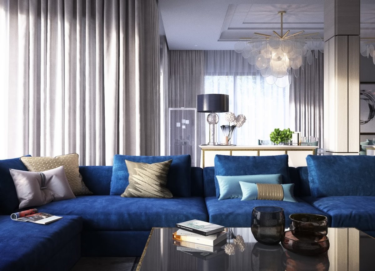 Синие диваны в интерьере гостиных