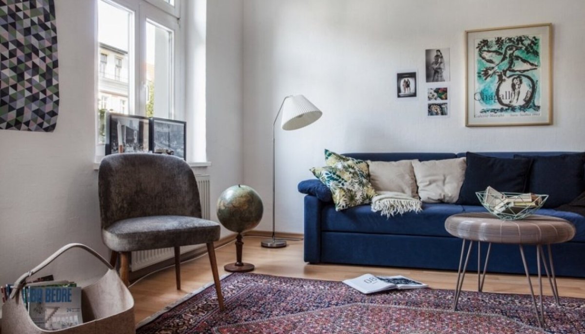 Зал в скандинавском стиле с синим диваном