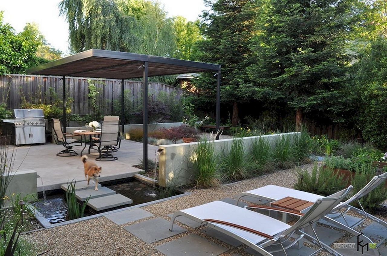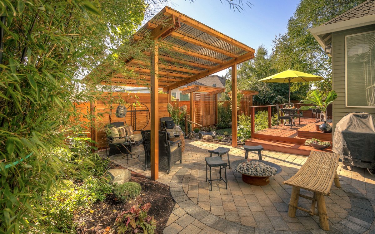 Патио с барбекю и деревянным навесом