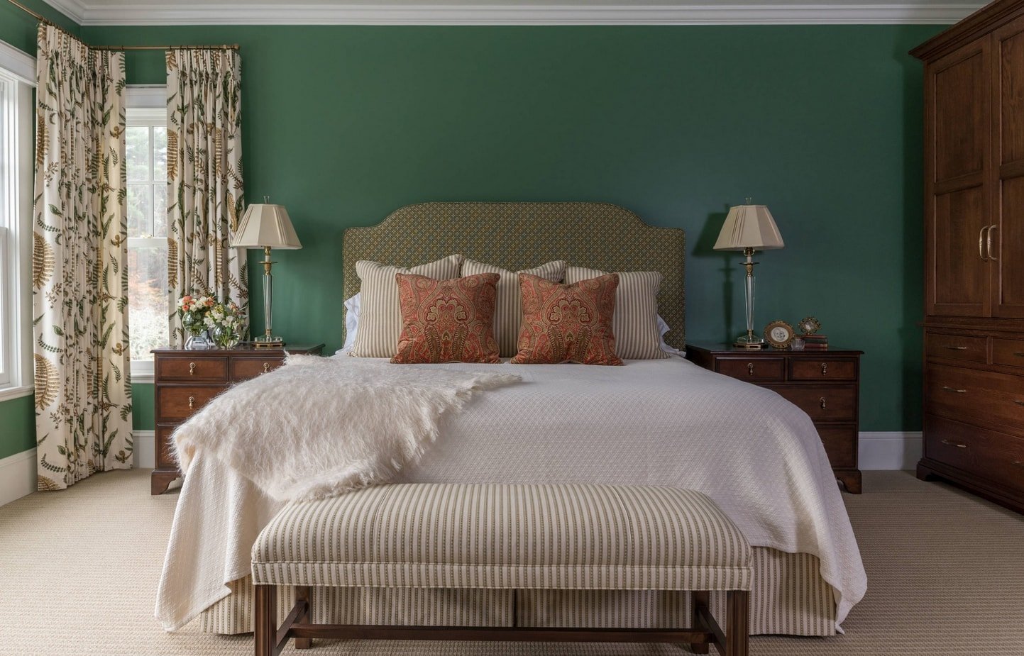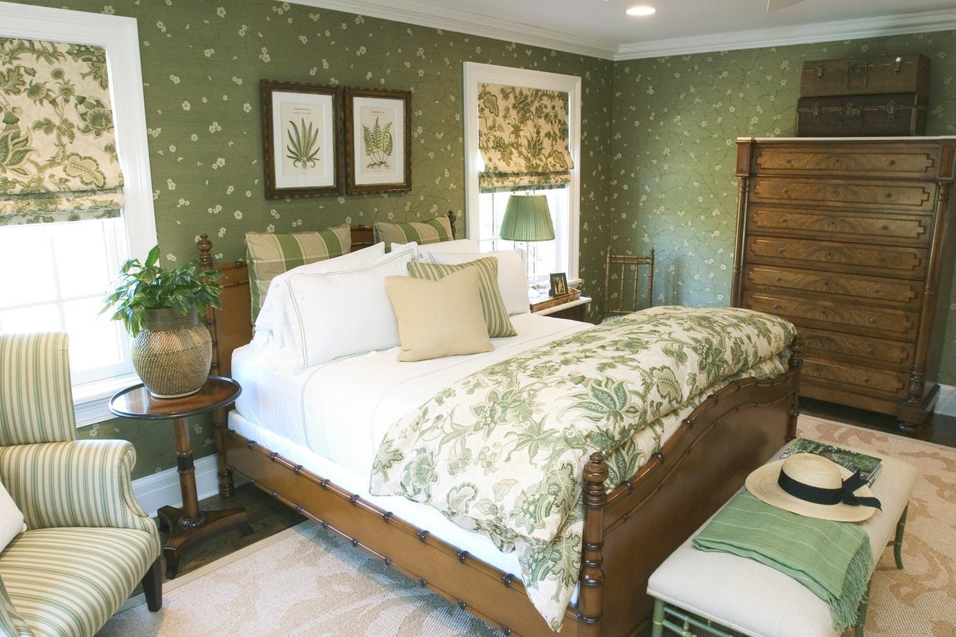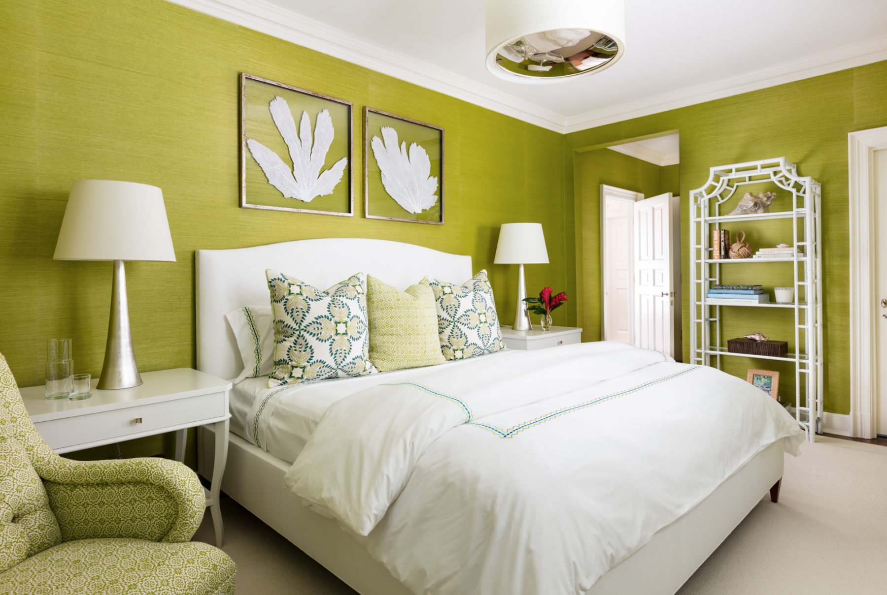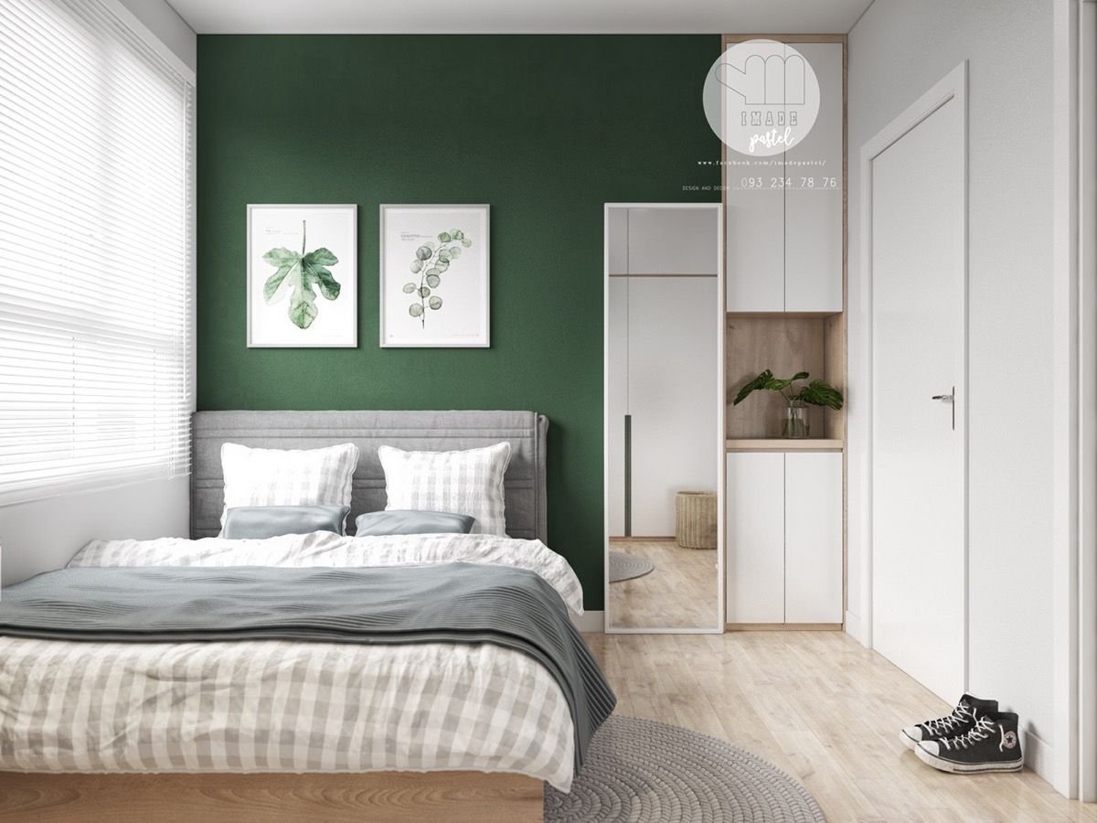 Зеленая спальня с белой мебелью
