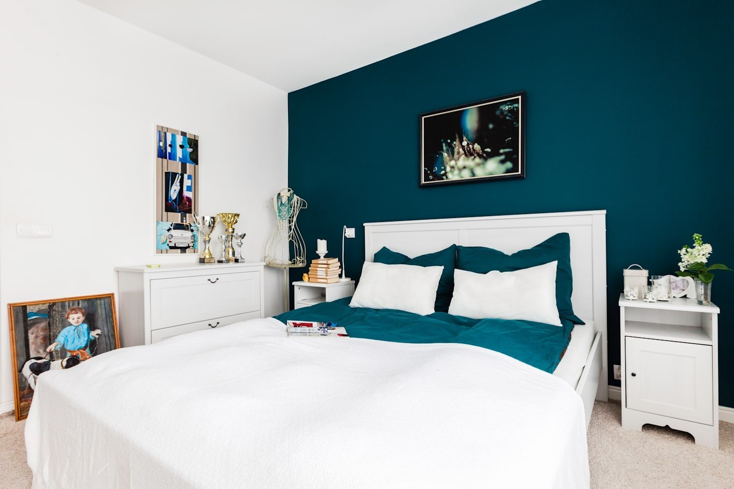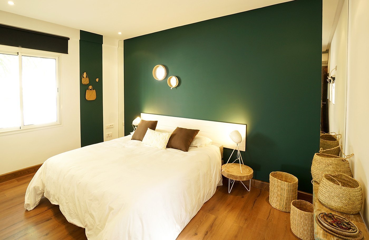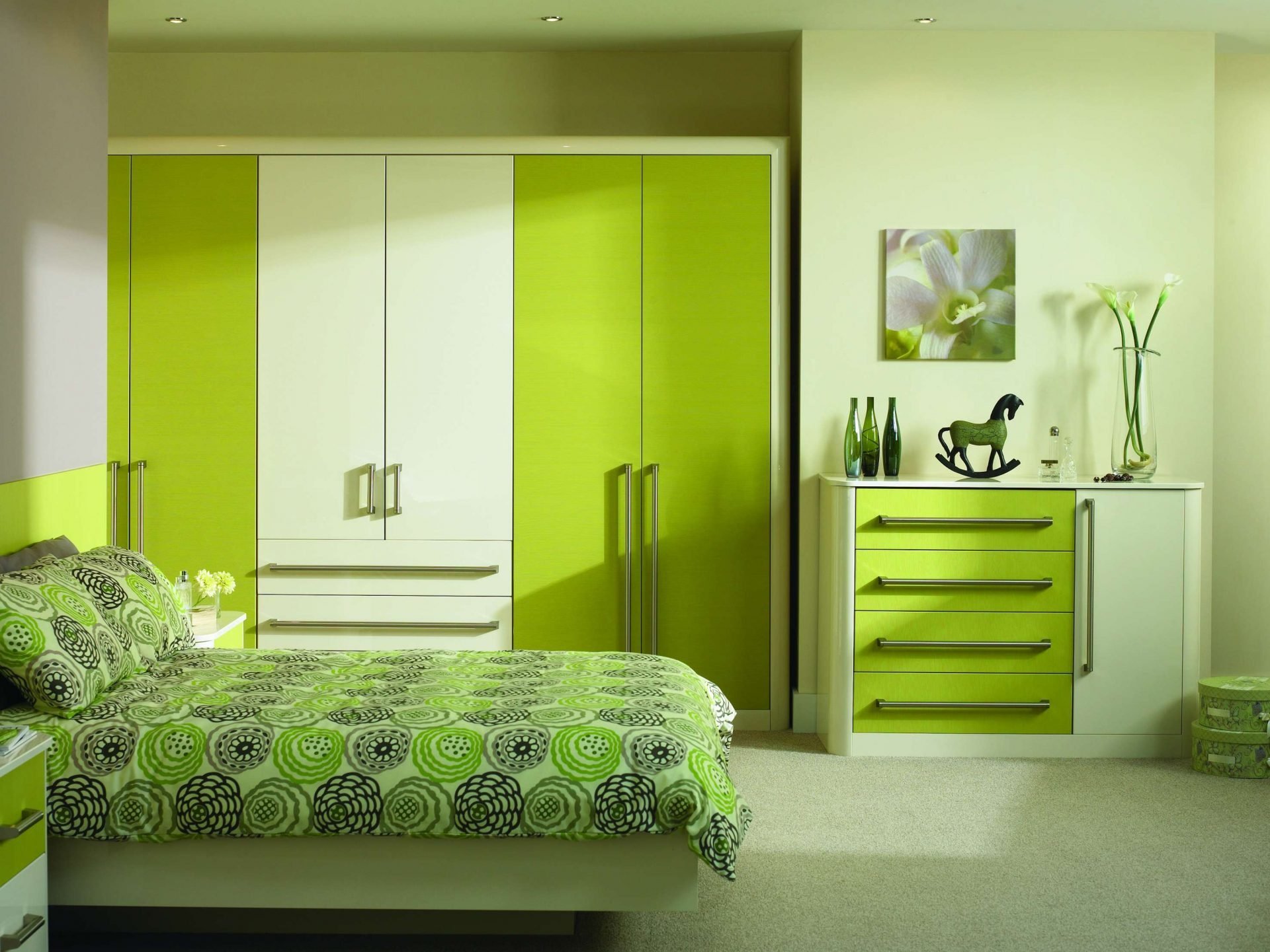 Зеленая спальня с белой мебелью