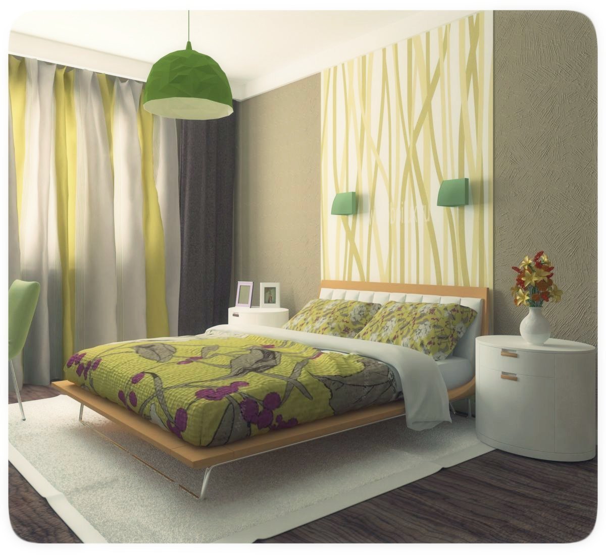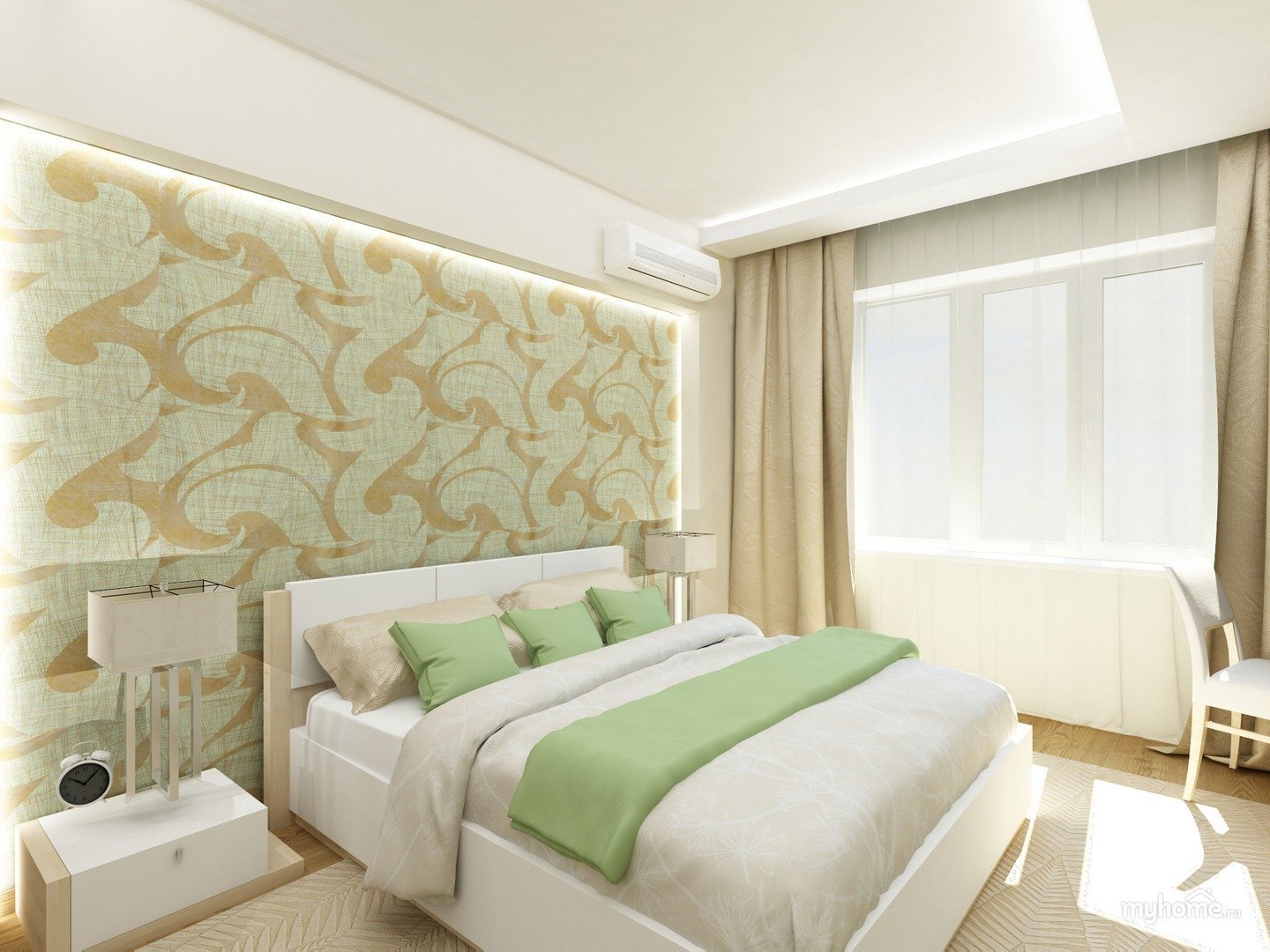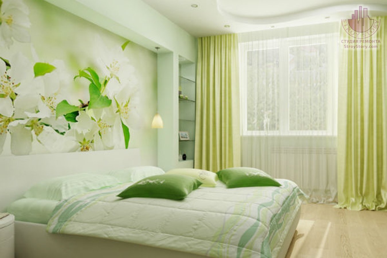 Спальня с зелеными обоими
