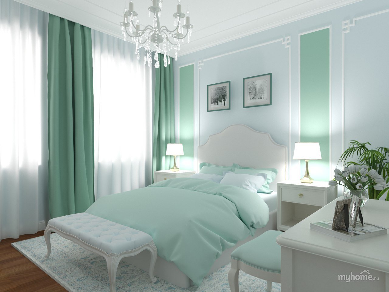 Спальня в бело изумрудных тонах