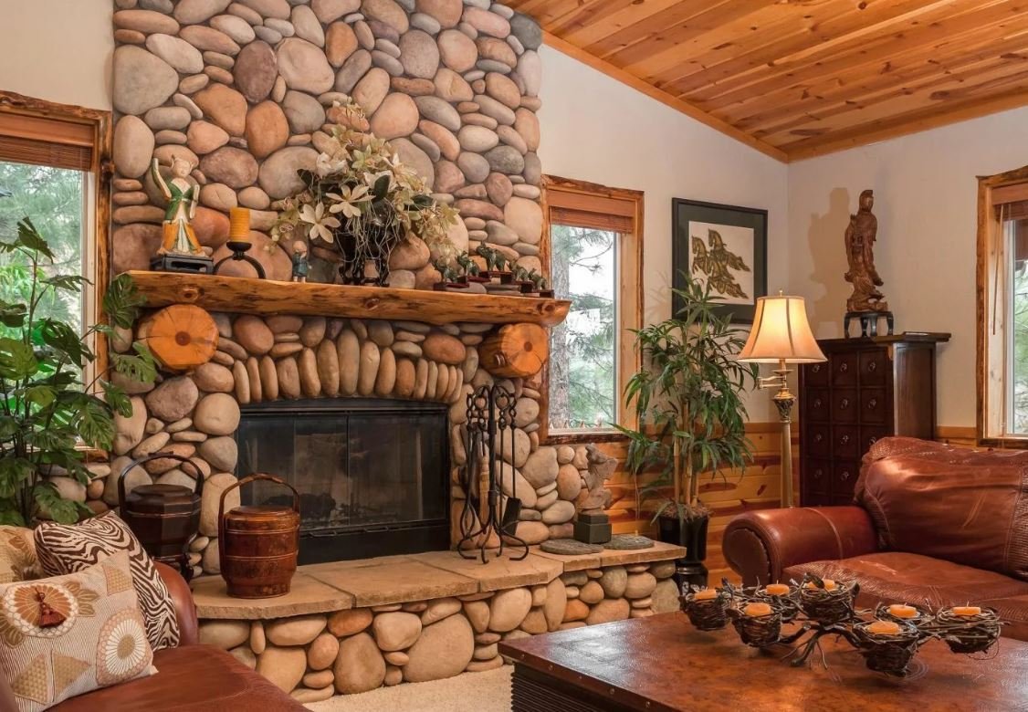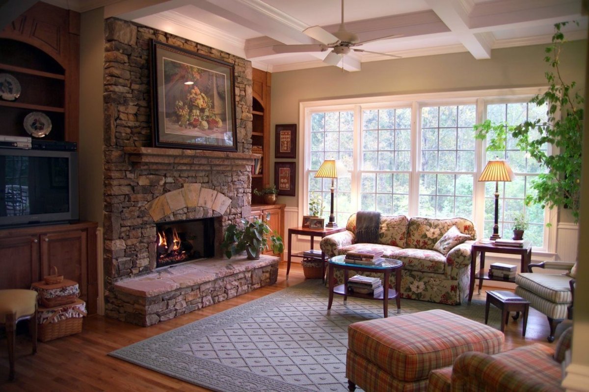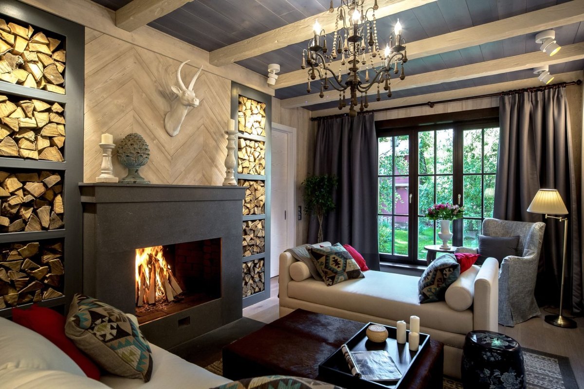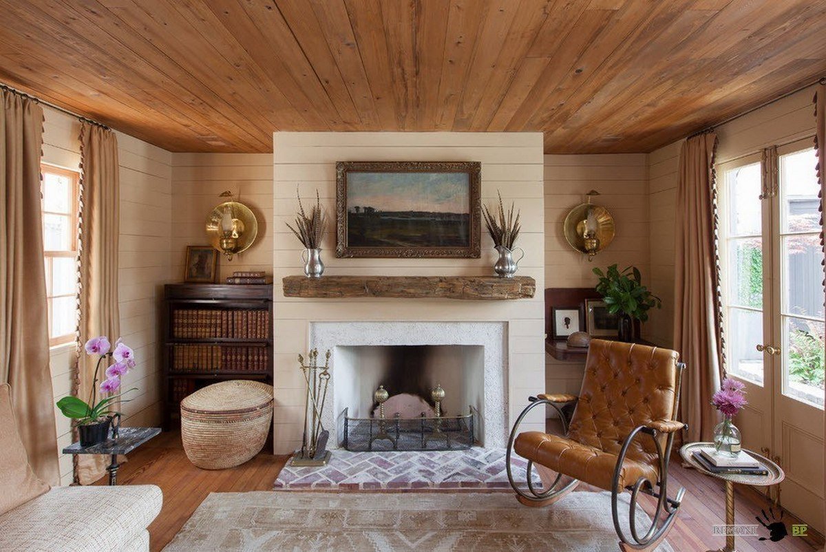 Деревенский стиль гостиной с камином