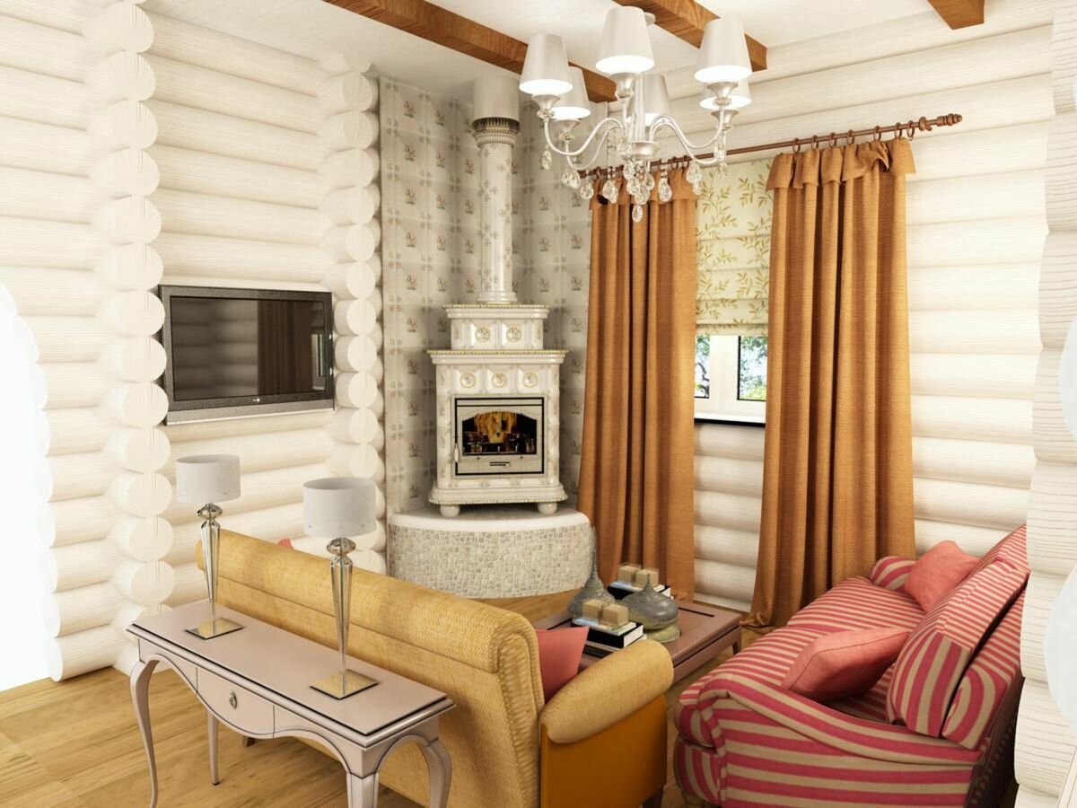 Гостиная с печкой в деревянном доме