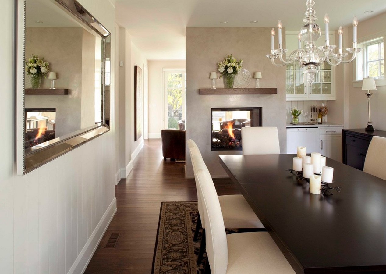 Гостиная с камином и обеденным столом