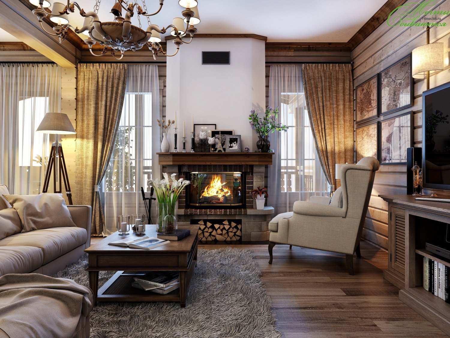 Интерьер с камином в загородном доме
