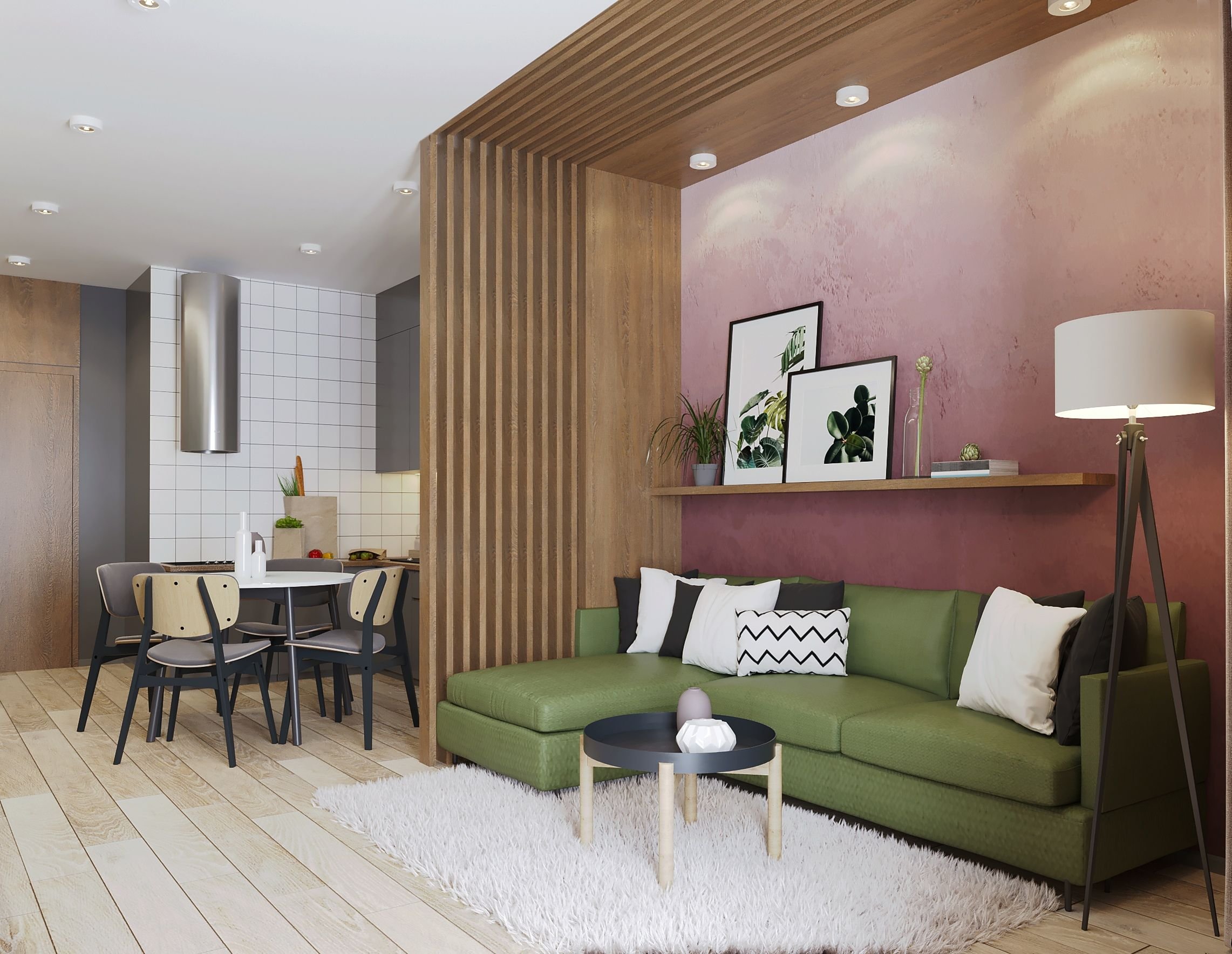 Рейки в интерьере кухни гостиной